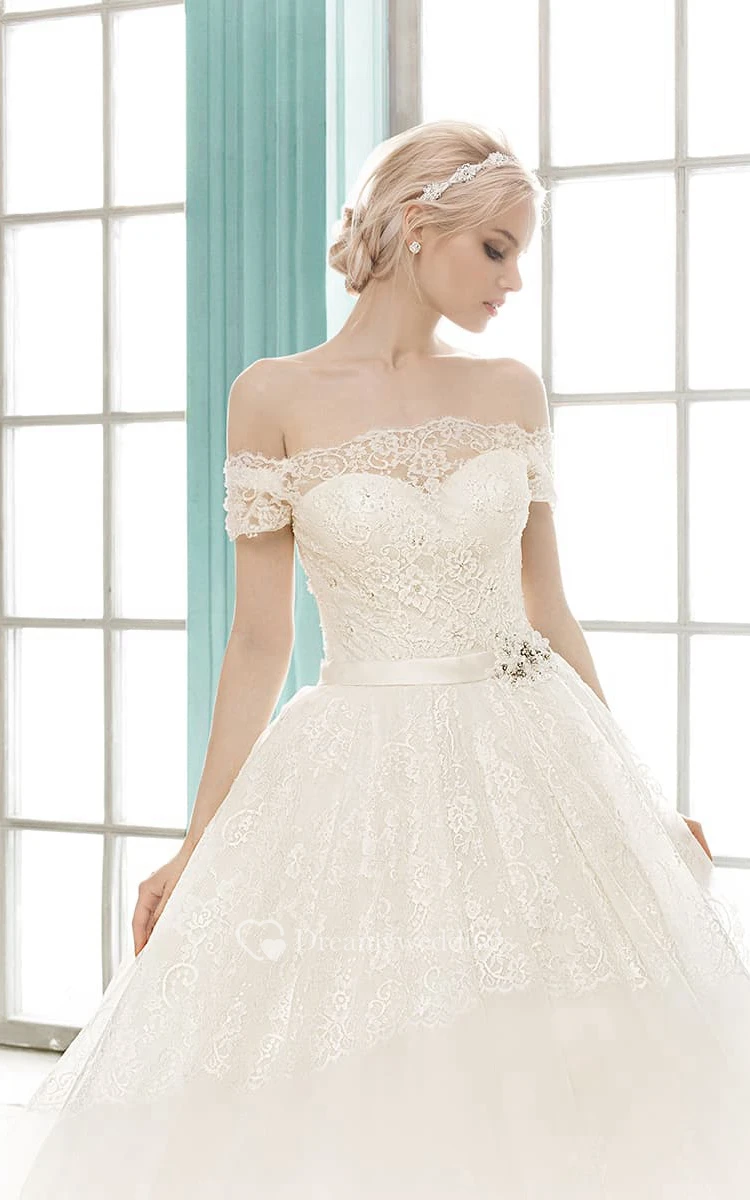 A-line Floor-length Off-the-shoulder Illusion Back Lace Dress With Flower