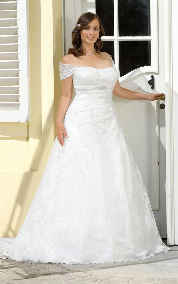 A-Line Floor-Length Off-The-Shoulder Lace Sweep Train Lace Dress