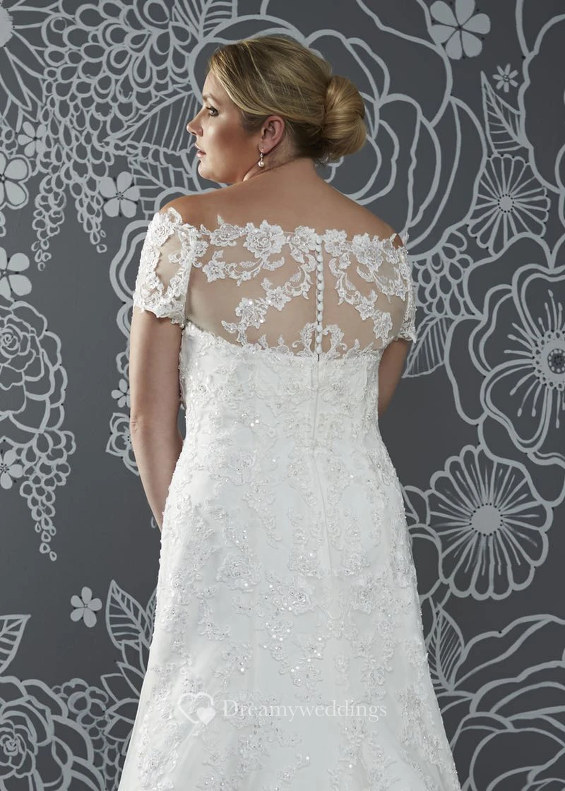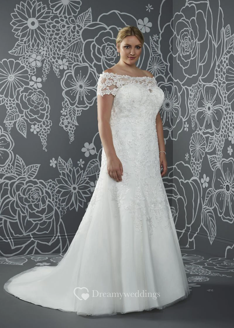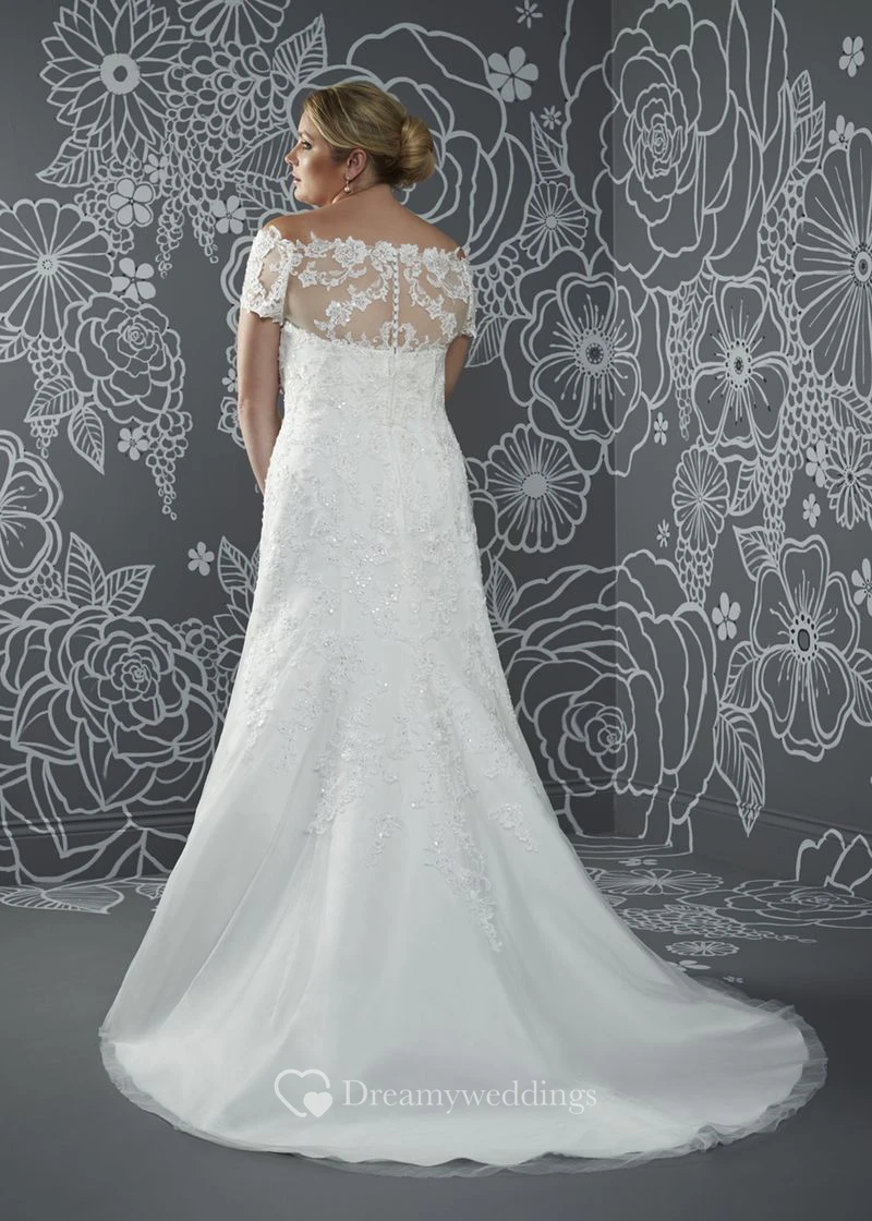 A-Line Floor-Length Off-The-Shoulder Satin Court Train Illusion Appliques Dress