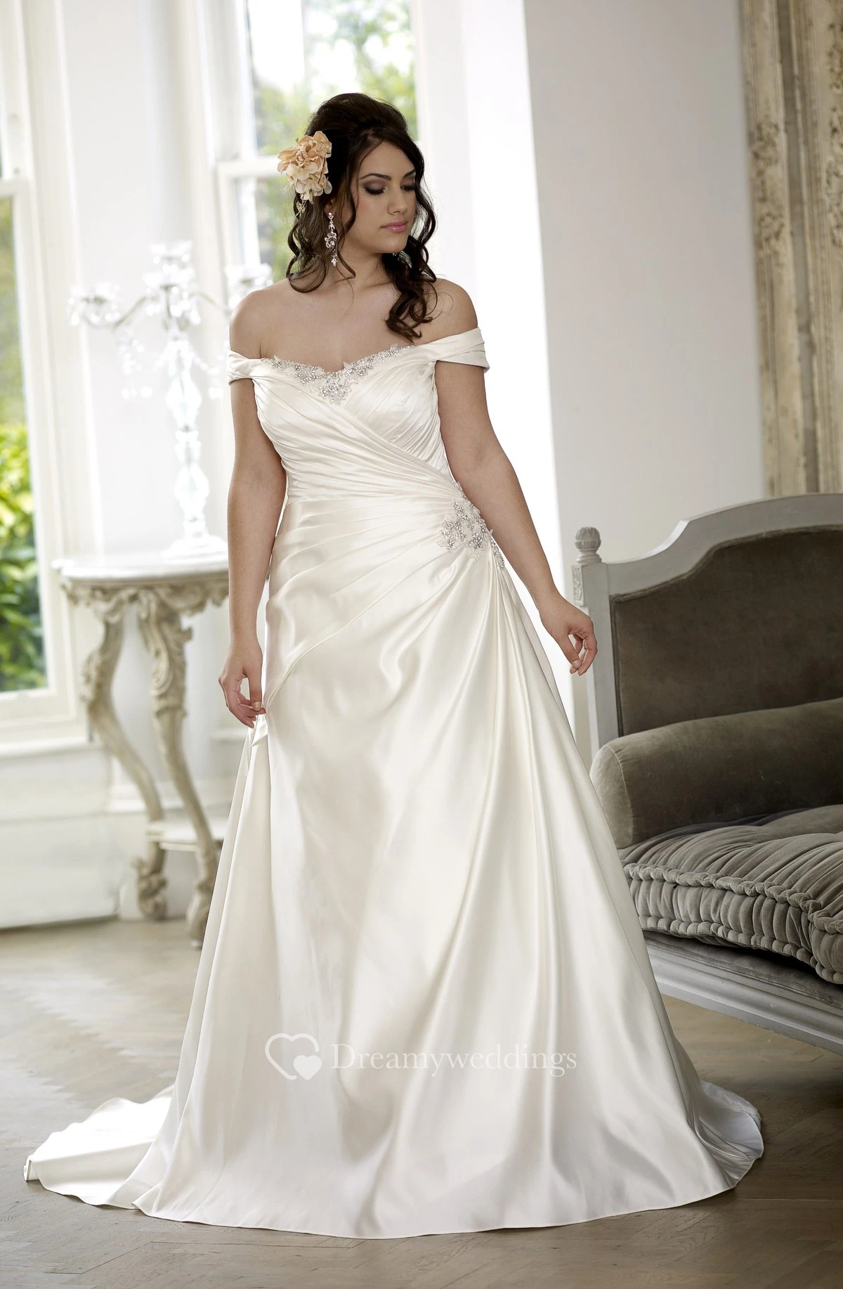 A-Line Floor-Length Off-The-Shoulder Satin Court Train Lace-Up Back Side Draping Dress
