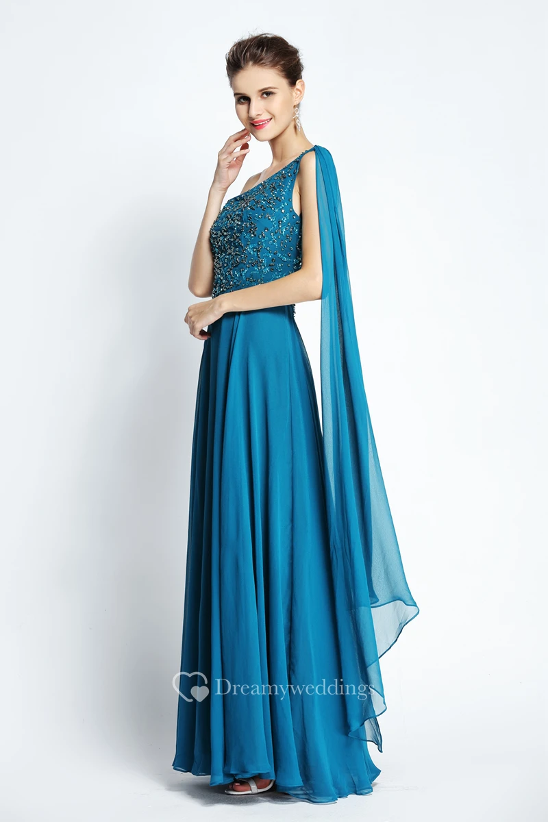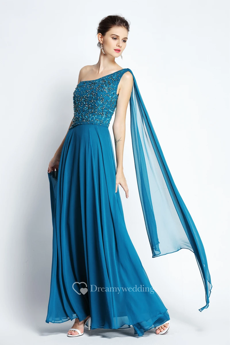 A-Line Floor-length One-shoulder Chiffon Sleeveless Prom Dress with Beading and Draping