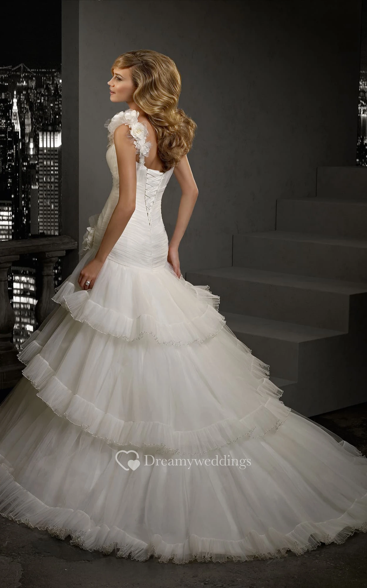 A-Line Floor-Length One-Shoulder Sleeveless Corset-Back Tulle Dress With Tiers And Flower