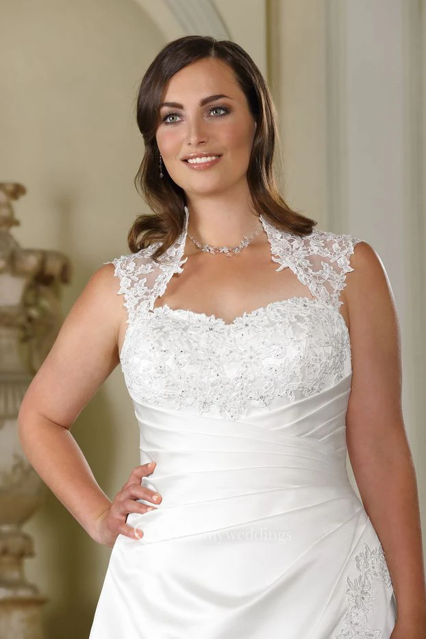 A-Line Floor-Length Queen Anne Sleeveless Satin Sweep Train Appliques Dress