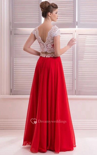 A-Line Floor-Length Scalloped Half Sleeve Satin Lace Beading Low-V Back Dress
