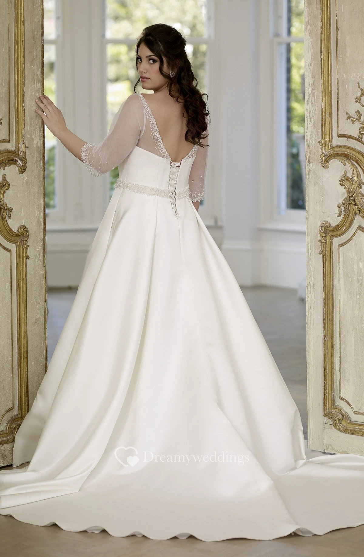 A-Line Floor-Length Scoop Neck Half Sleeve Illusion Satin Court Train Low-V Back Beading Dress