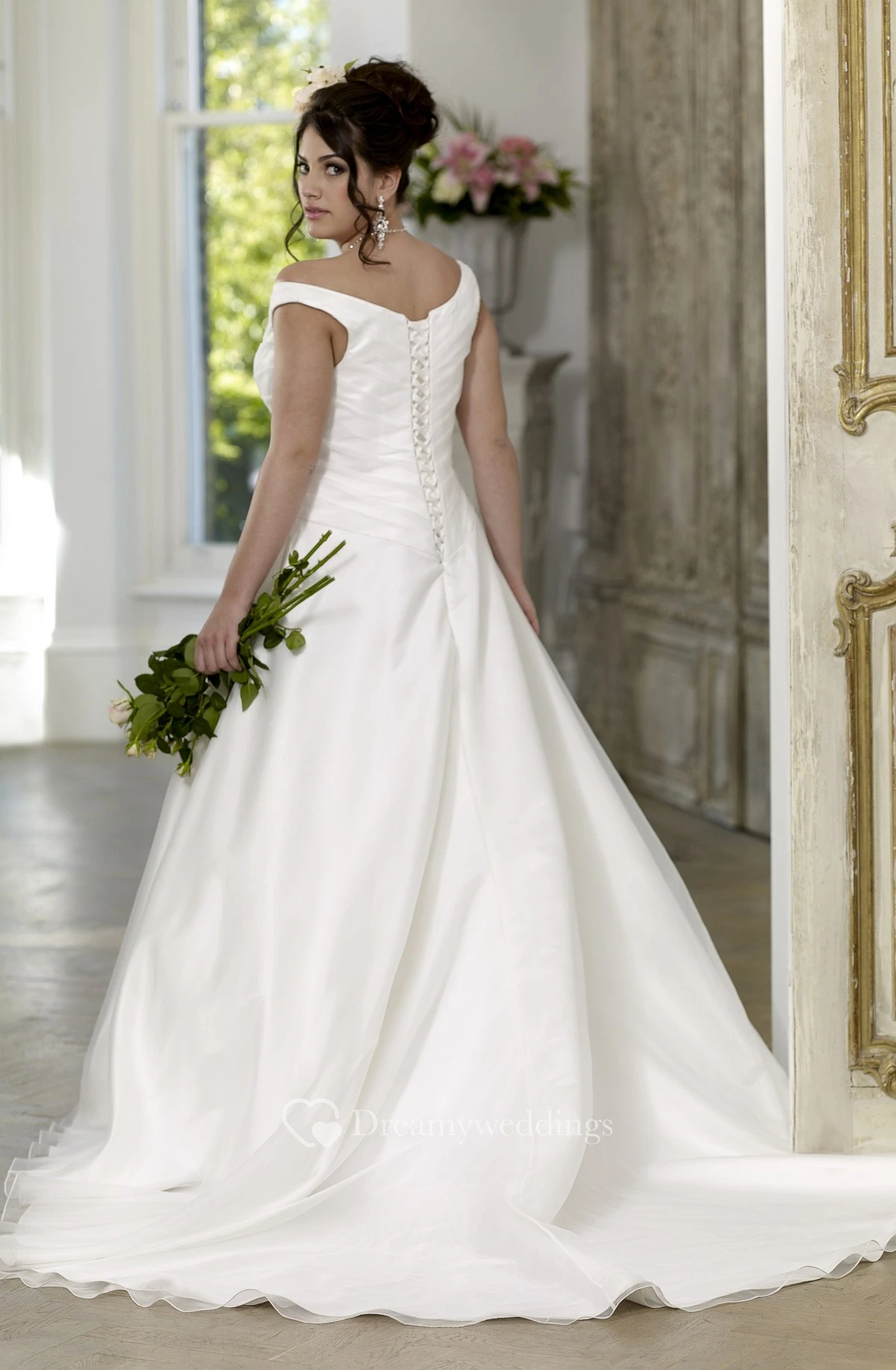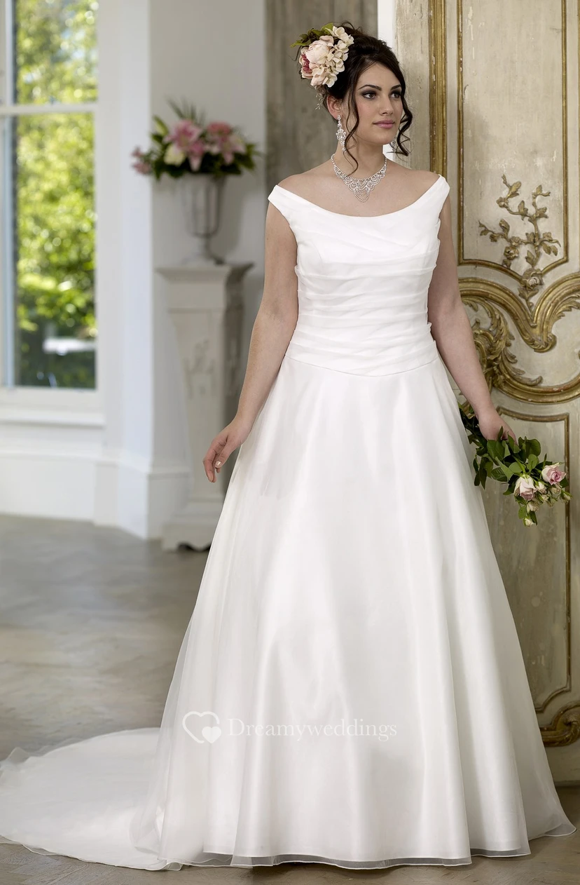 A-Line Floor-Length Scoop Neck Satin Court Train Lace-Up Back Ruching Dress