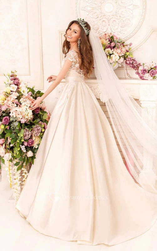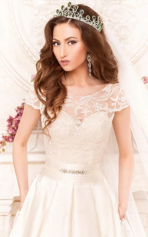 A-Line Floor-Length Scoop Short-Sleeve Low-V-Back Satin Dress With Lace
