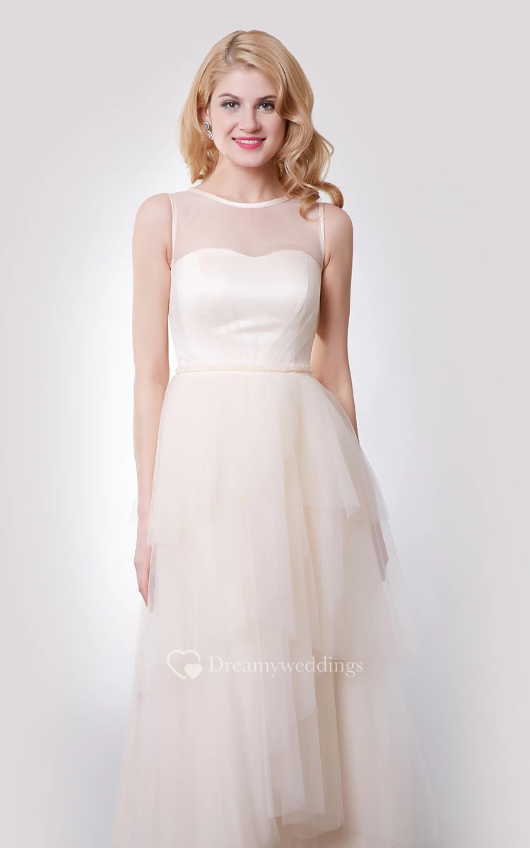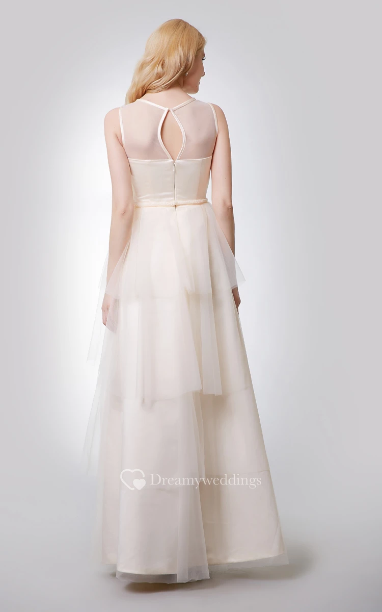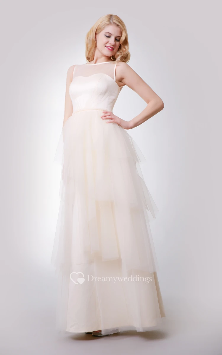 A-Line Floor Length Sleeveless Dress With Layered Skirt and Illusion Top