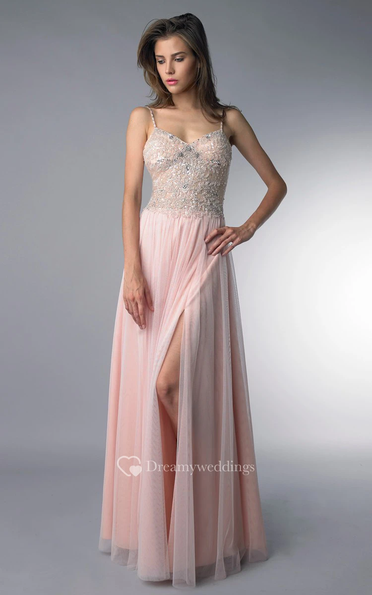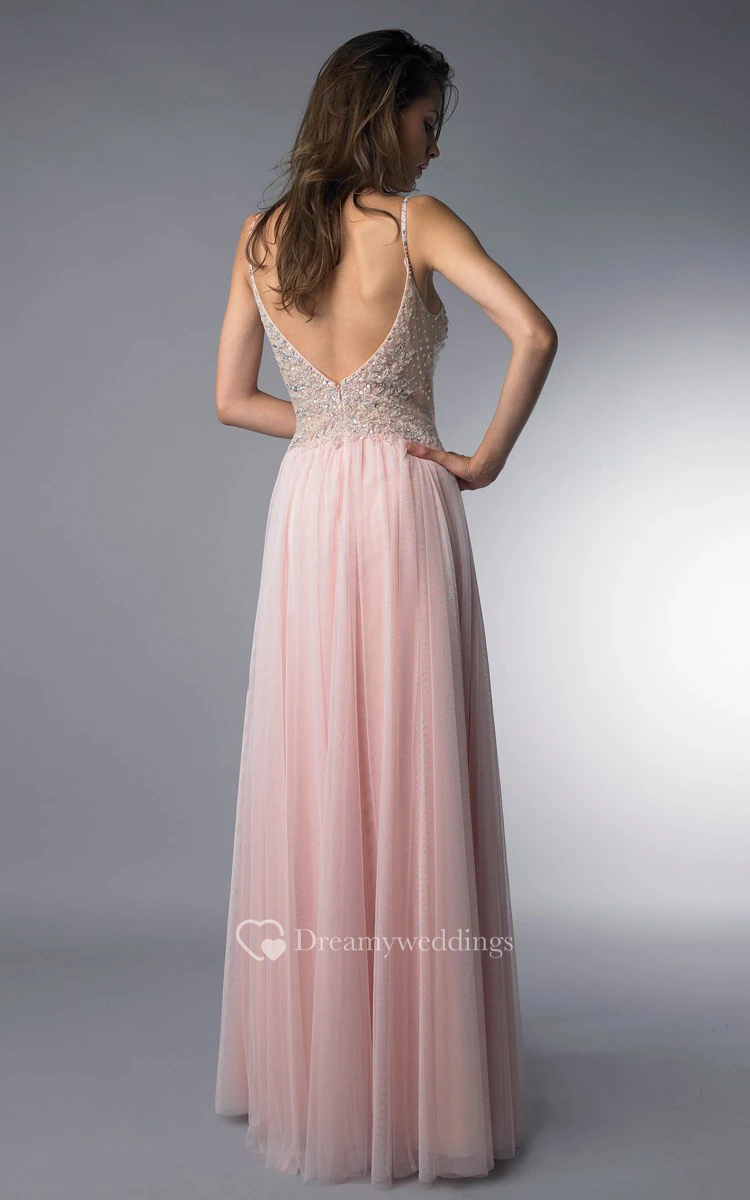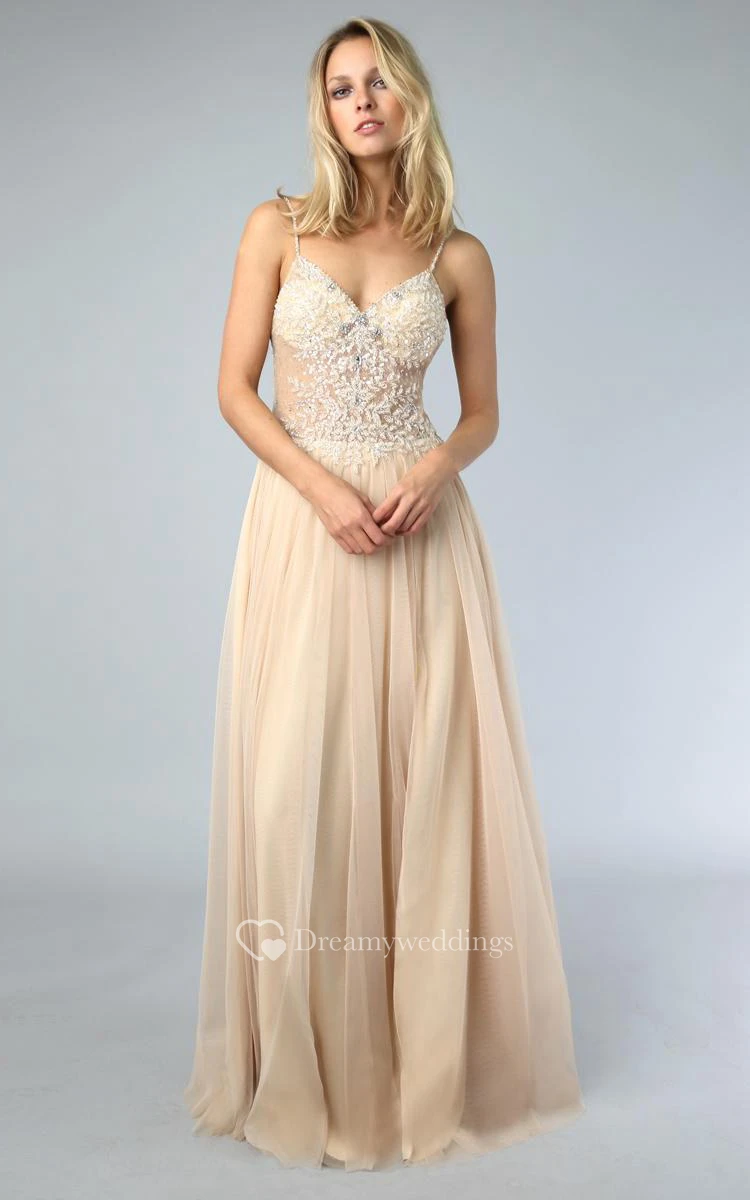 A-line Floor-length Spaghetti-strap Sleeveless Tulle Low-V Back Dress