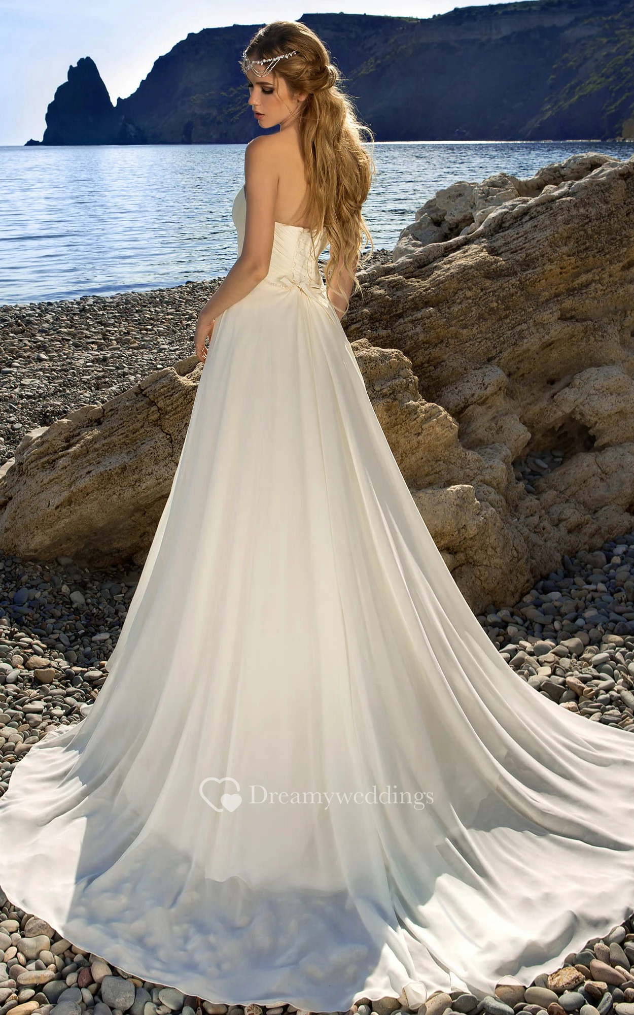 A-Line Floor-Length Strapless Sleeveless Backless Chiffon Dress With Waist Jewellery And Ruching