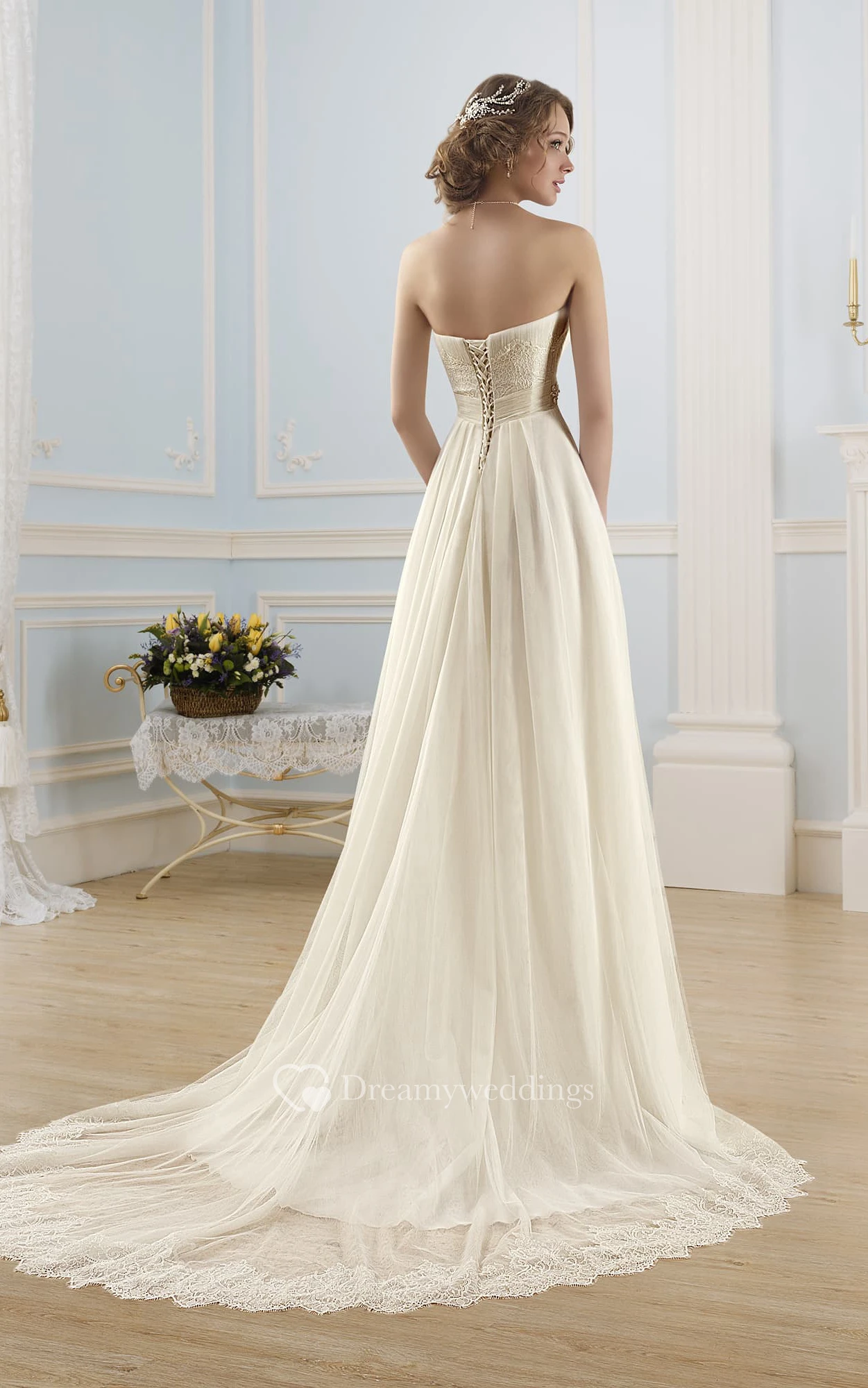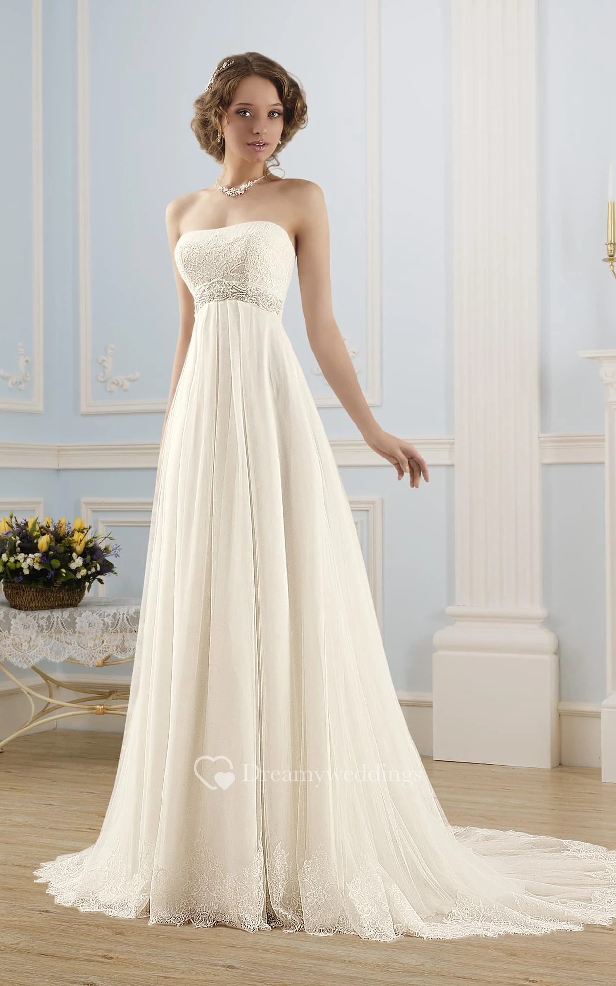 A-Line Floor-Length Strapless Sleeveless Empire Corset-Back Lace Tulle Dress With Waist Jewellery And Pleats