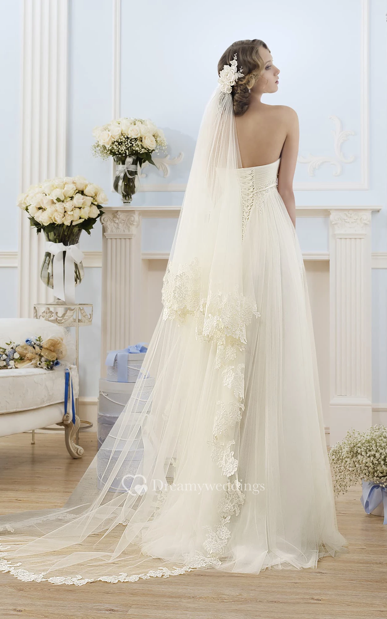A-Line Floor-Length Strapless Sleeveless Empire Lace-Up Tulle Dress With Ruching