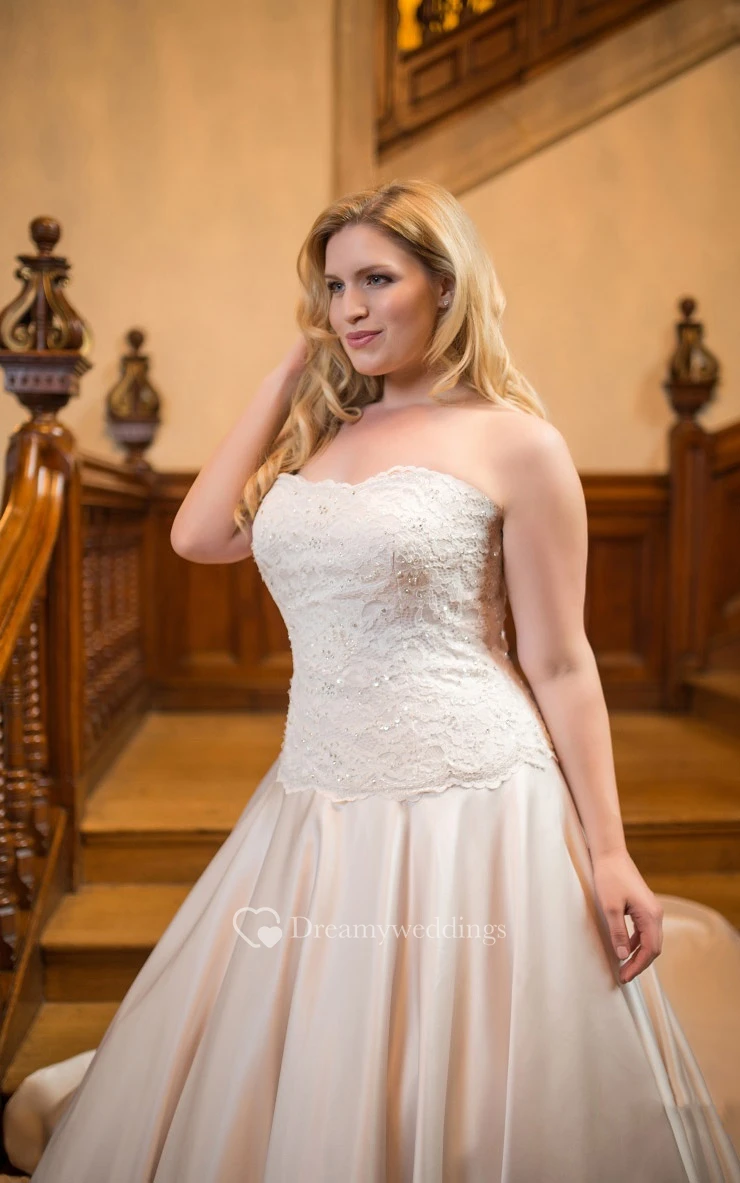 A-Line Floor-Length Strapless Sleeveless Satin Court Train Lace Dress