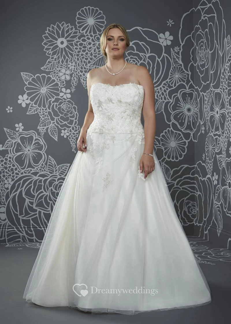 A-Line Floor-Length Strapless Sleeveless Satin Court Train Lace-Up Back Appliques Dress