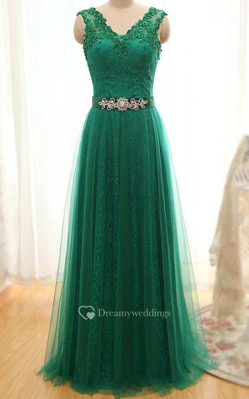 A-line Floor-length Straps V-neck Sleeveless Tulle Dress