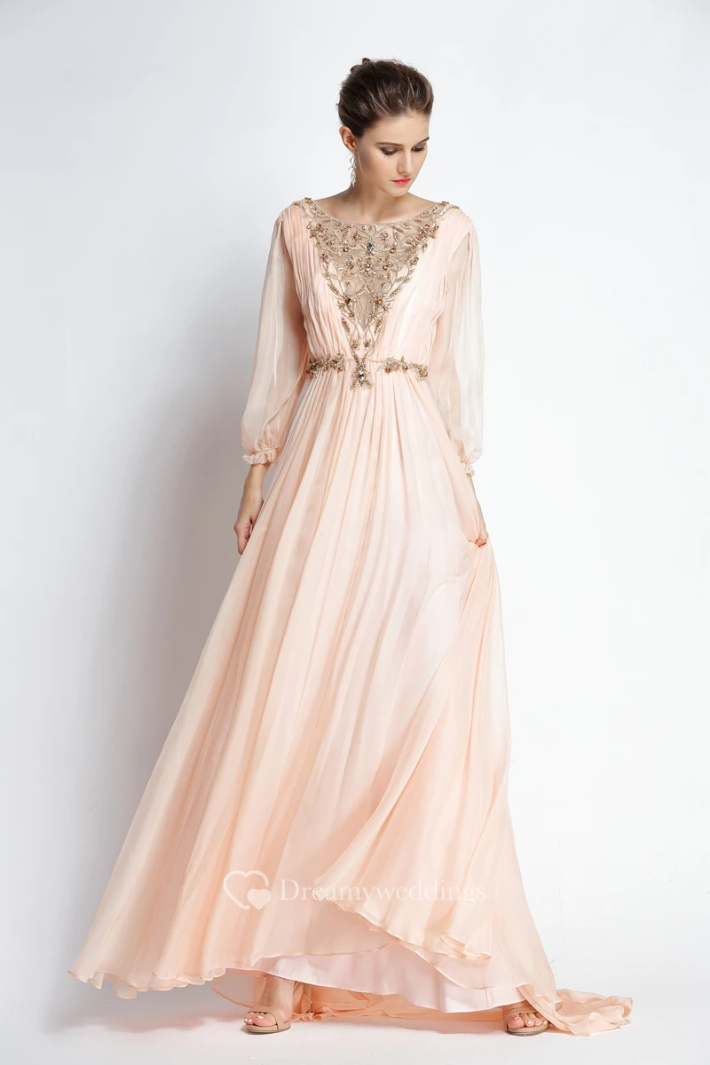 A-Line Floor-length Sweep Brush Train Bateau Chiffon Long Sleeve Prom Dress with Beading and Pleats