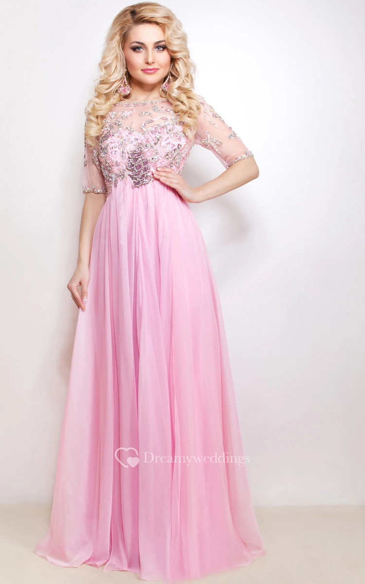A-Line Floor-Length Sweep High-Neck Half Sleeve Empire Chiffon Beading Pleats Illusion Dress