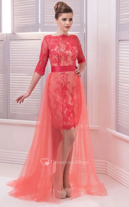 A-Line Floor-Length Sweep High-Neck Half Sleeve Lace Pleats Sash Illusion Dress