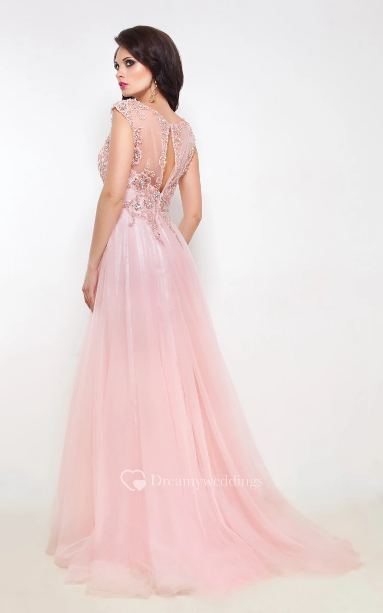 A-Line Floor-Length Sweep Jewel Short Sleeve Tulle Beading Pleats Keyhole Dress