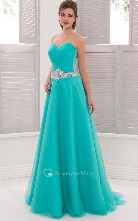 A-Line Floor-Length Sweep Sweetheart Sleeveless Tulle Crystal Detailing Pleats Zipper Dress