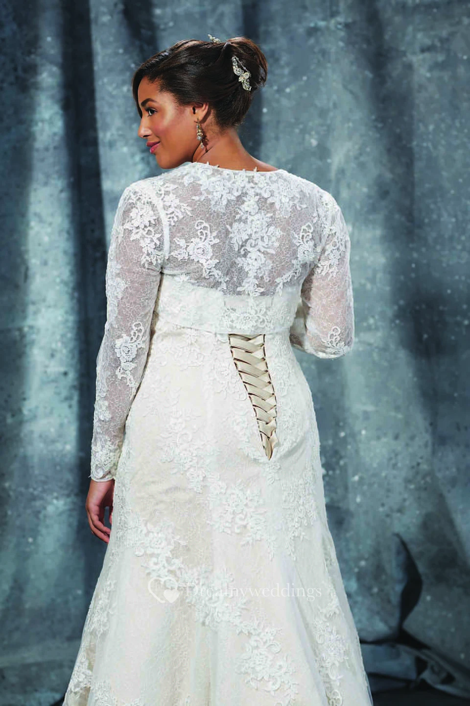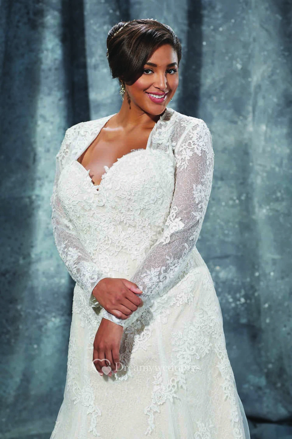 A-Line Floor-Length Sweetheart Long Sleeve Lace Sweep Train Lace-Up Back Appliques Dress