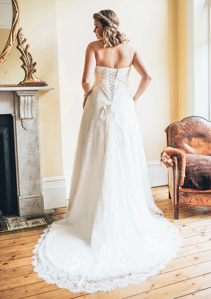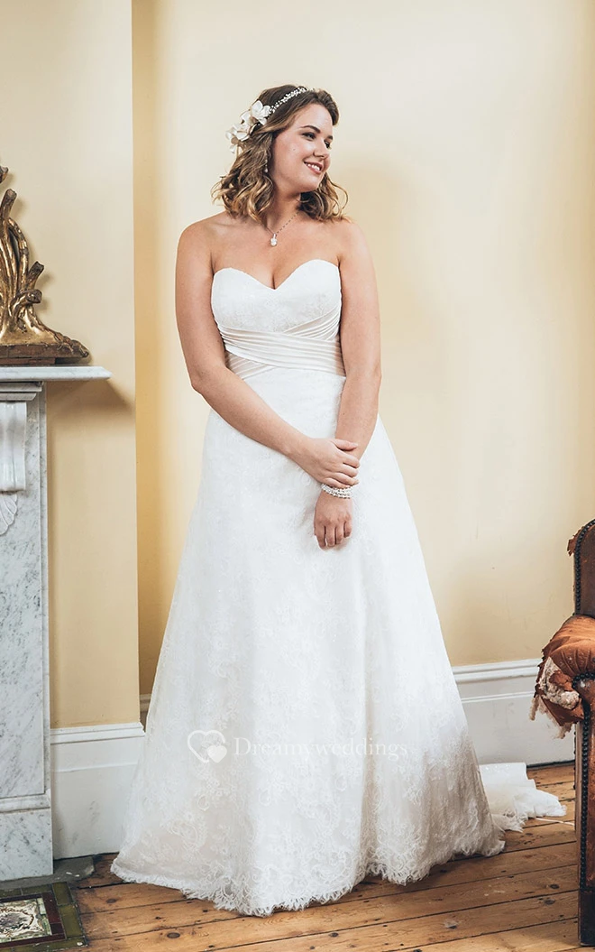 A-Line Floor-Length Sweetheart Sleeveless Lace Court Train Lace-Up Back Appliques Dress