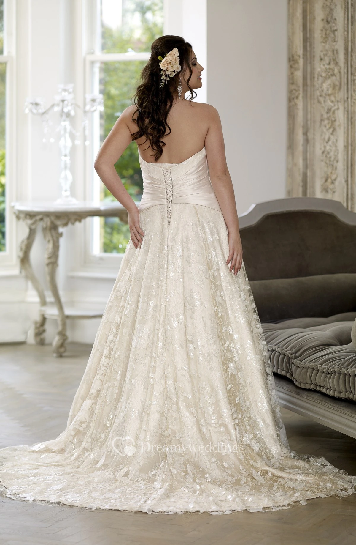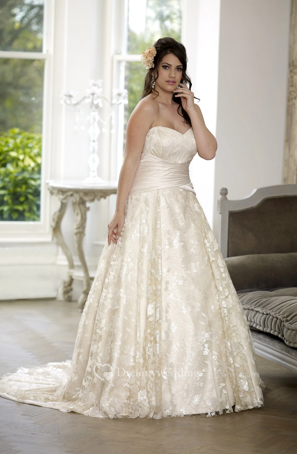 A-Line Floor-Length Sweetheart Sleeveless Lace Court Train Lace-Up Back Pleats Dress