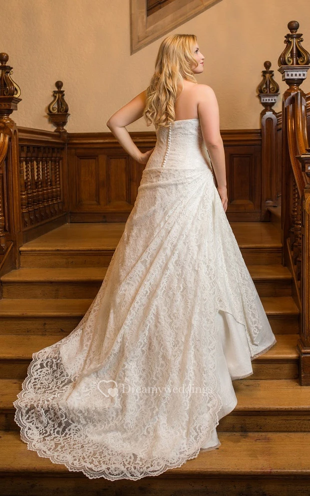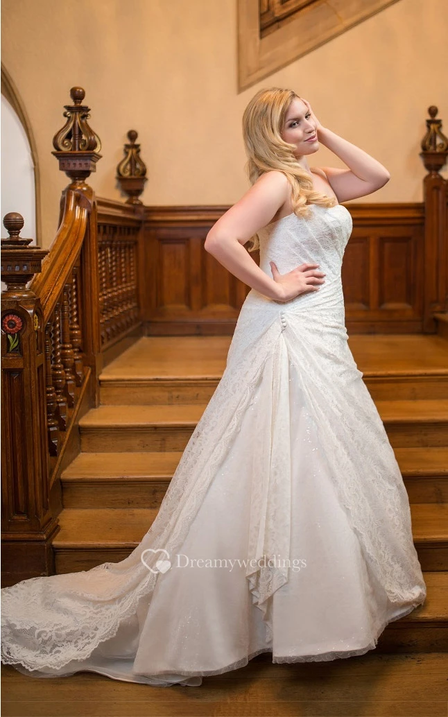 A-Line Floor-Length Sweetheart Sleeveless Lace Court Train Side Draping Dress