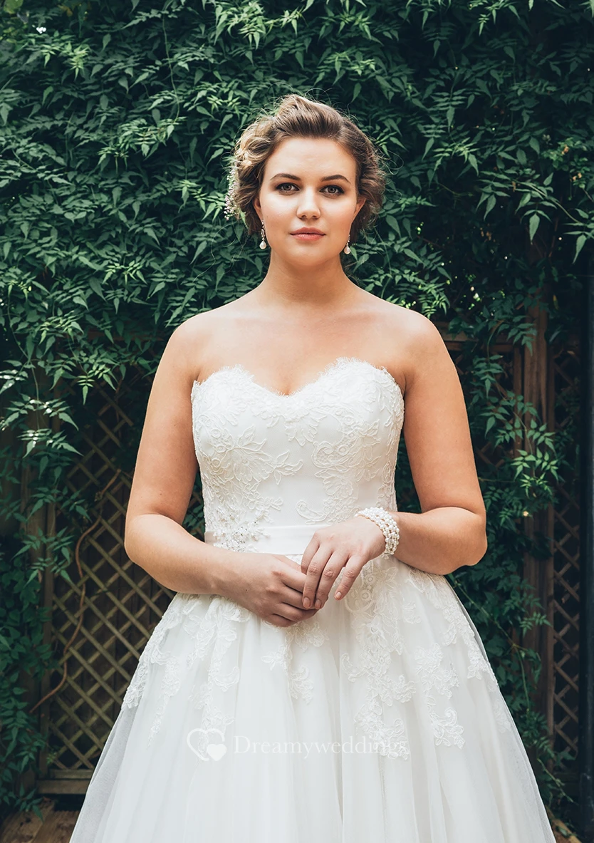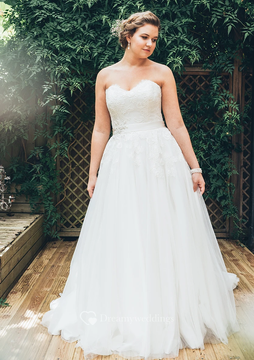 A-Line Floor-Length Sweetheart Sleeveless Tulle Court Train Appliques Dress