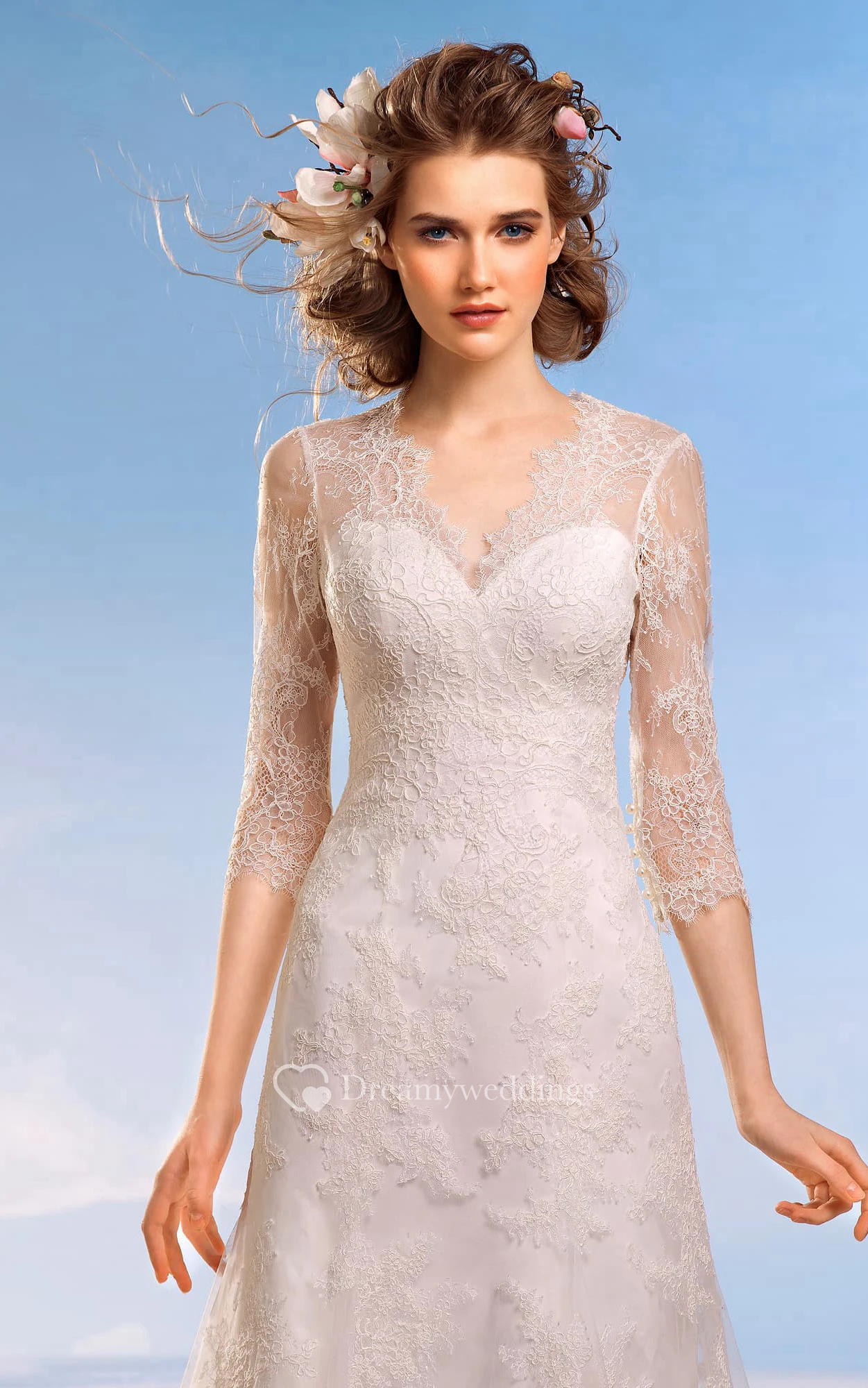 A-Line Floor-Length V-Neck 3-4-Sleeve Keyhole Lace Dress With Appliques