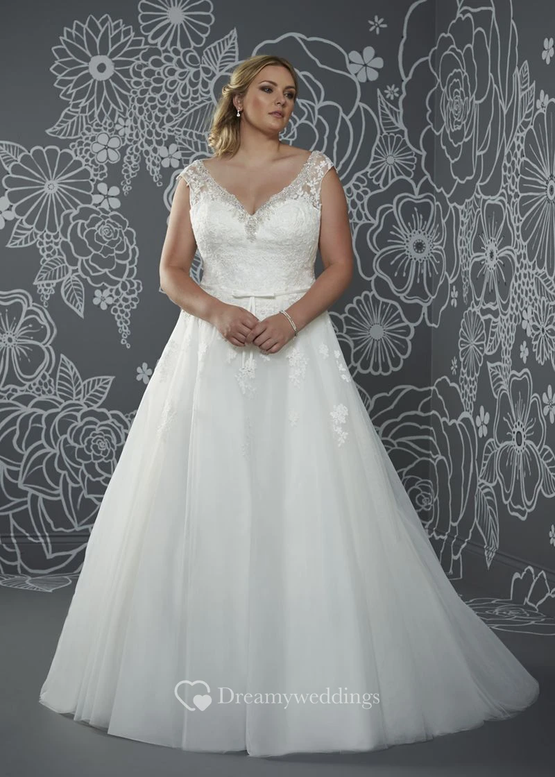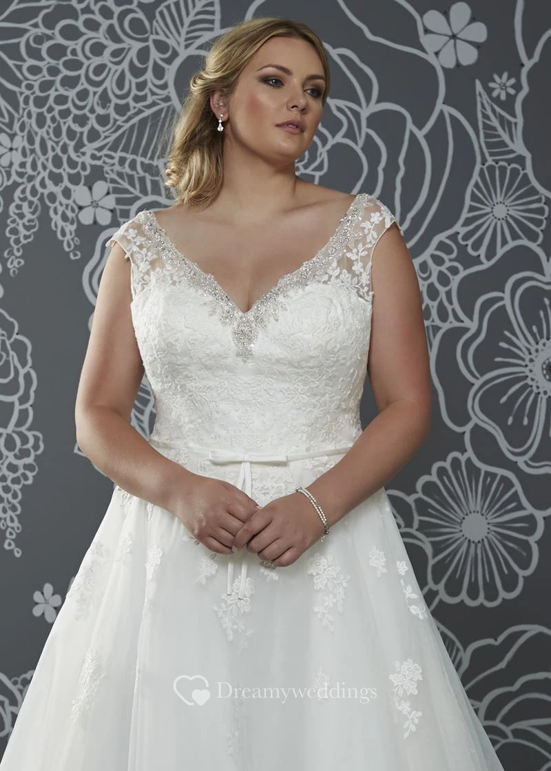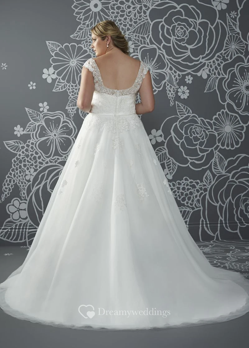 A-Line Floor-Length V-Neck Cap Tulle Court Train Low-V Back Beading Dress