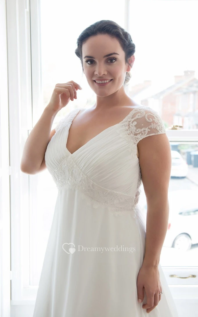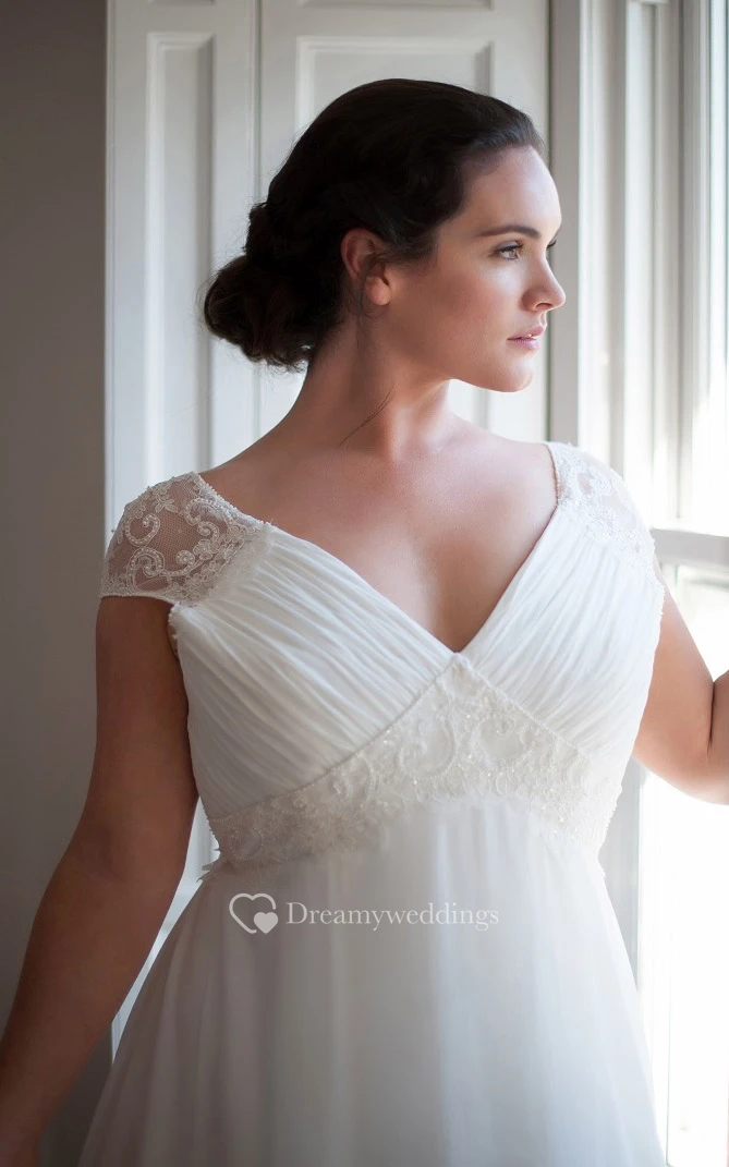 A-Line Floor-Length V-Neck Short Sleeve Chiffon Sweep Train Ruching Dress