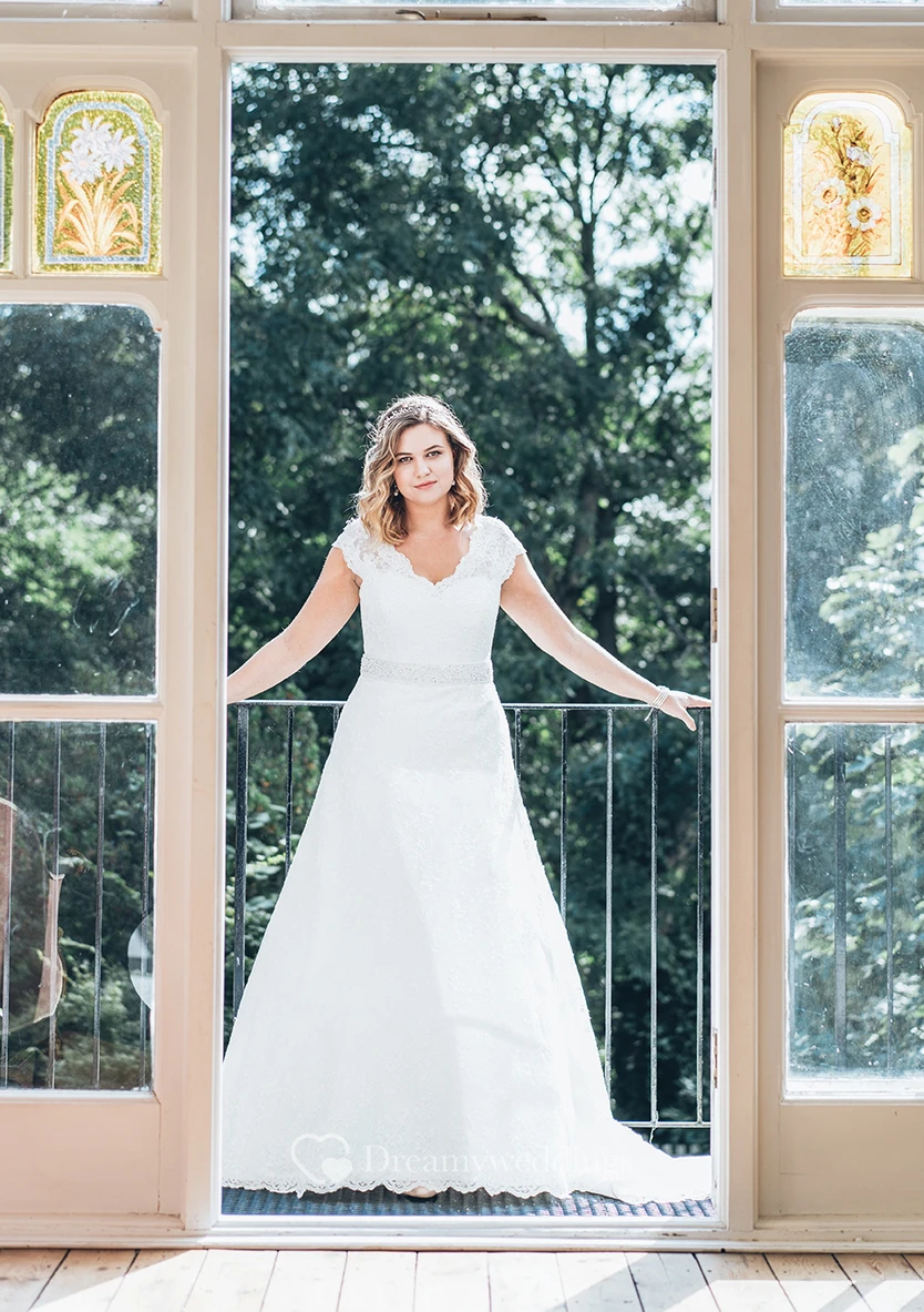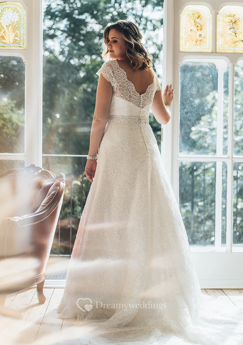 A-Line Floor-Length V-Neck Short Sleeve Lace Sweep Train Low-V Back Waist Jewellery Dress