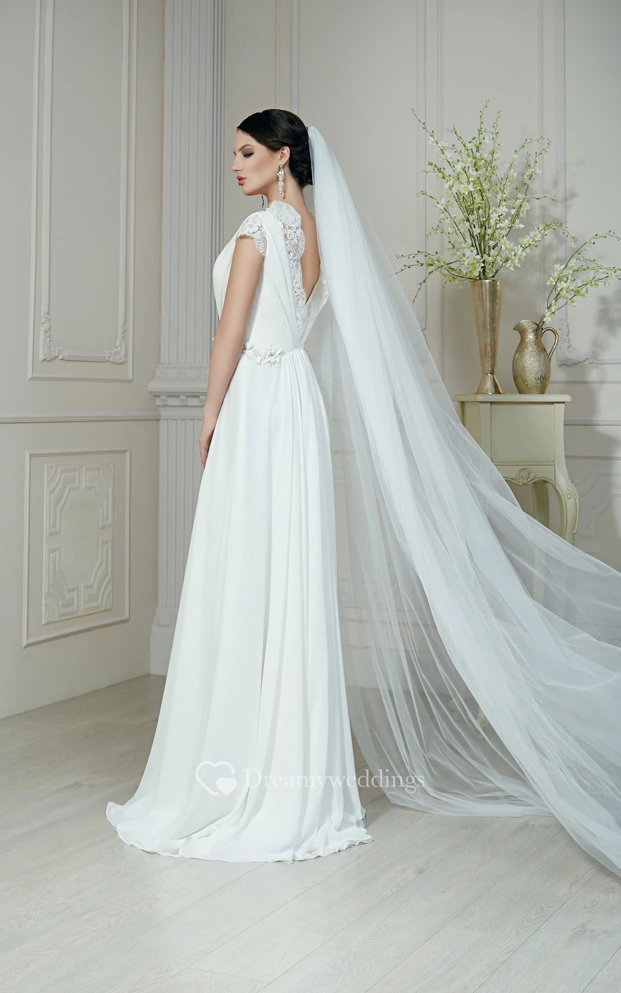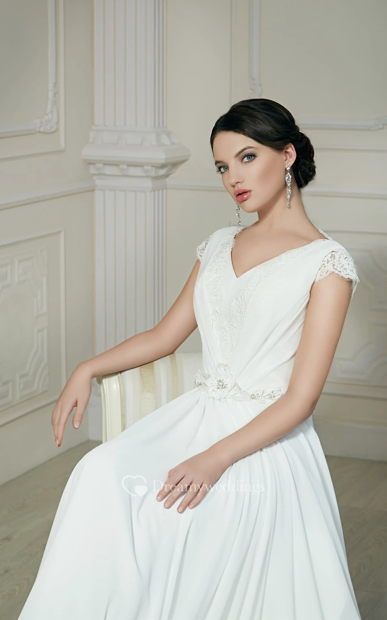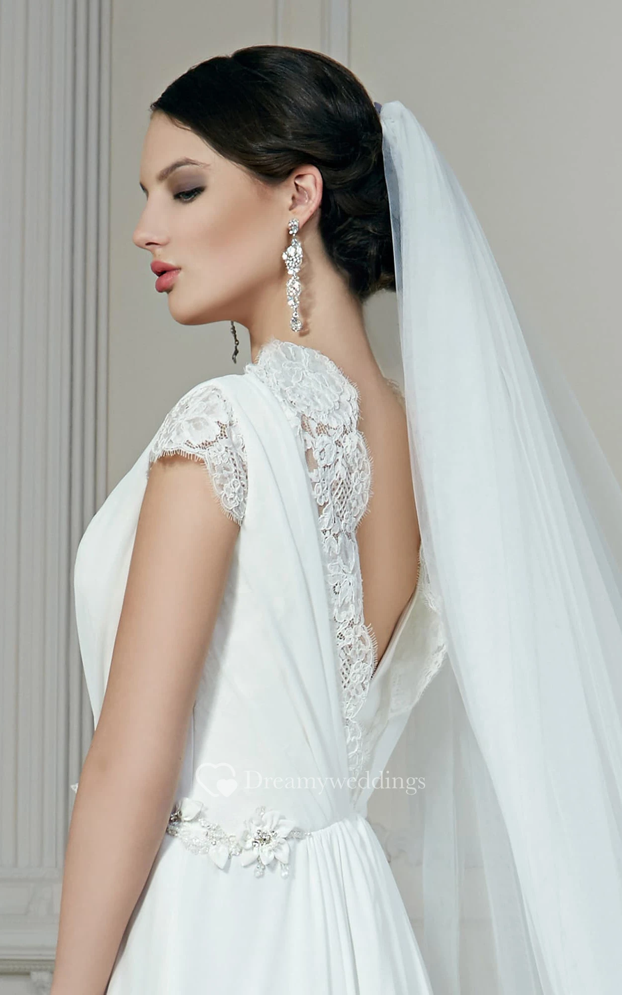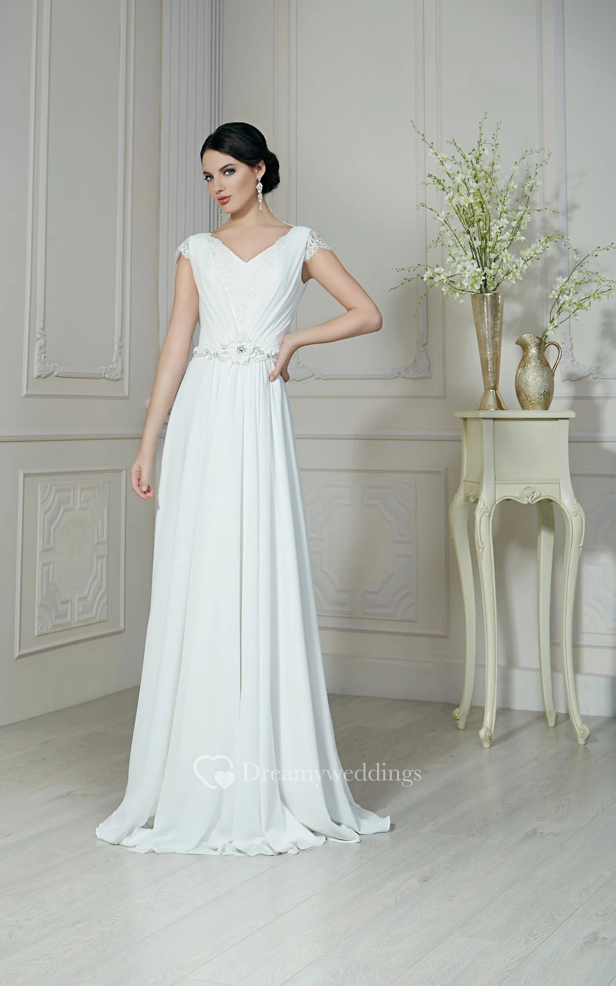A-Line Floor-Length V-Neck Short-Sleeve Low-V-Back Chiffon Dress With Ruching And Beading