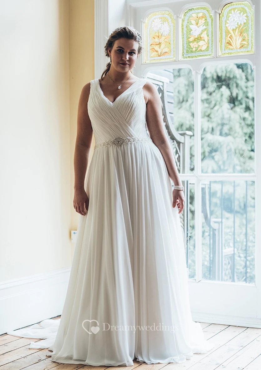 A-Line Floor-Length V-Neck Sleeveless Chiffon Court Train Ruching Dress
