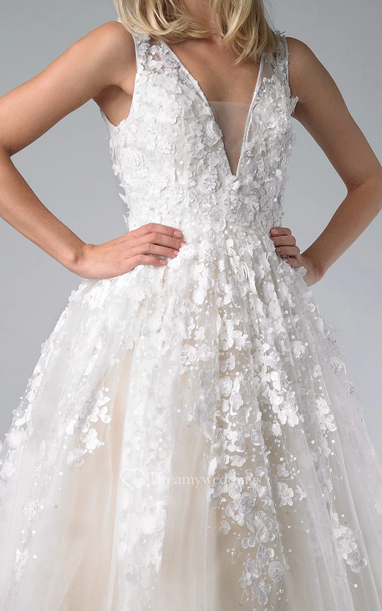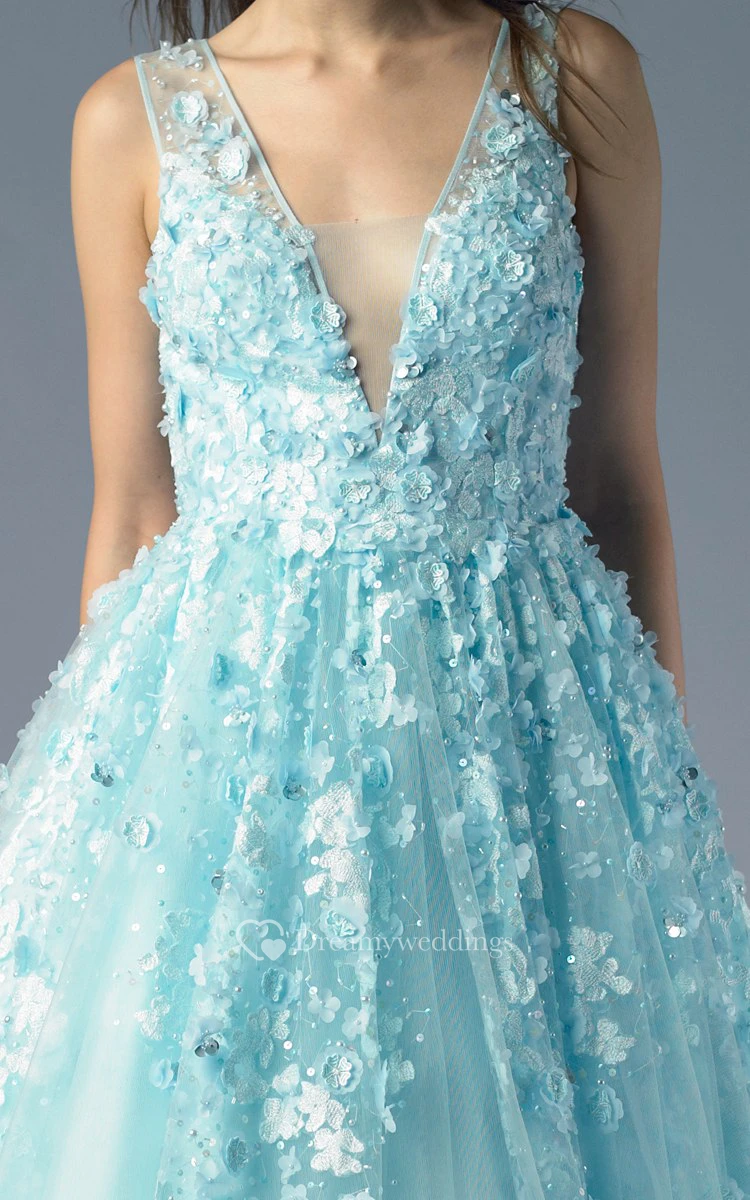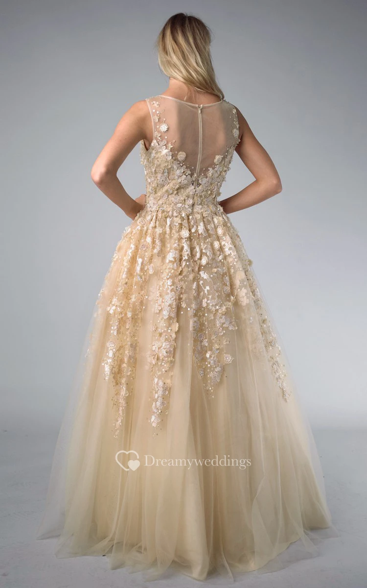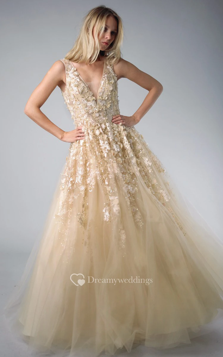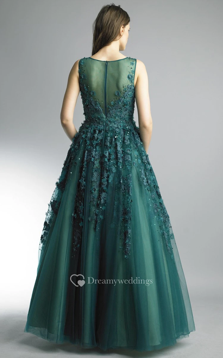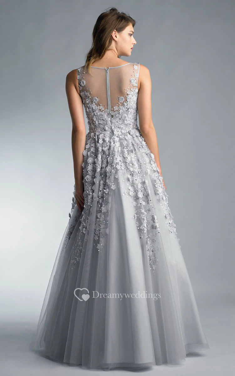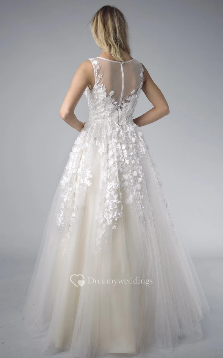 A-line Floor-length V-neck Sleeveless Tulle Illusion Dress