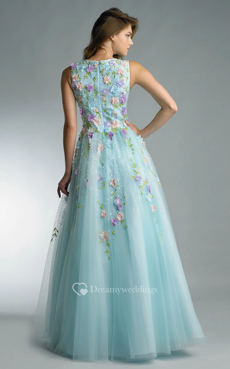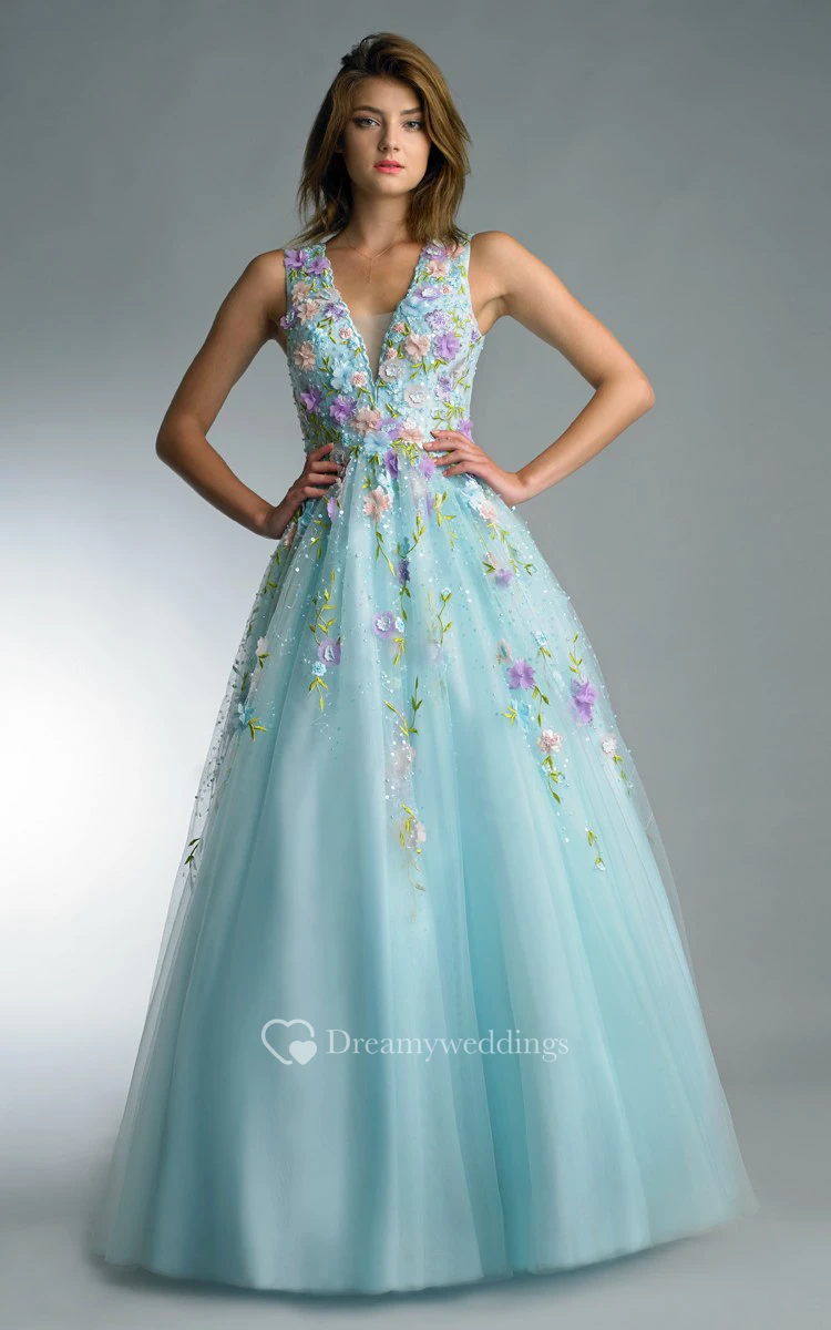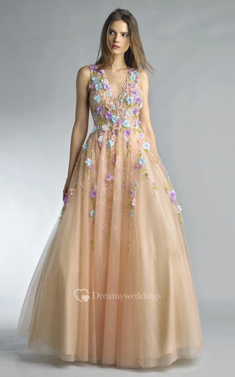 A-line Floor-length V-neck Sleeveless Tulle Zipper Dress