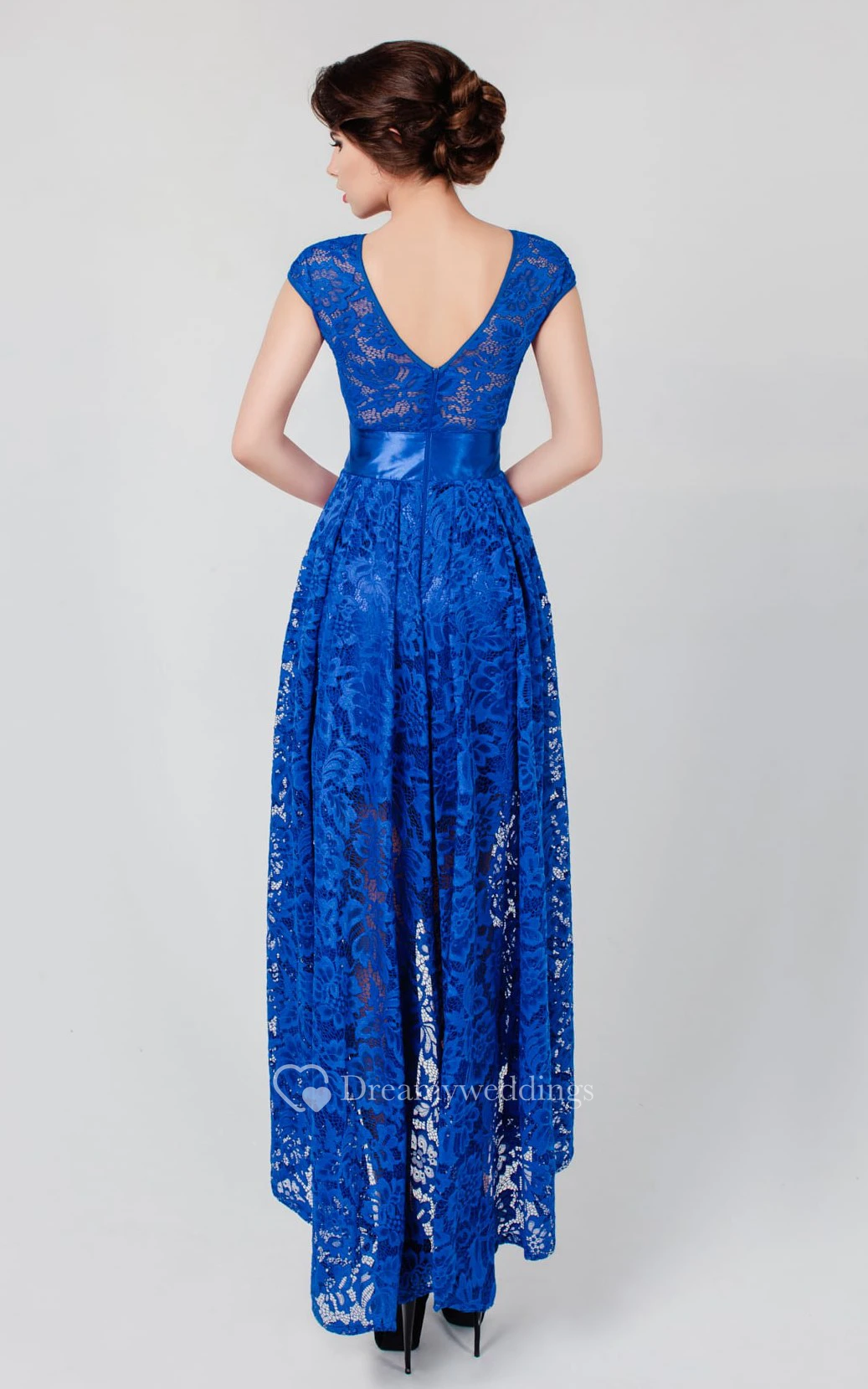 A-line High-low High Neck Short Sleeve Lace Low-V Back Dress