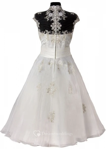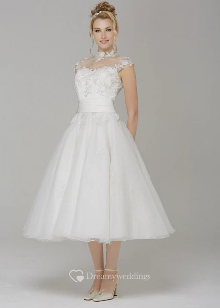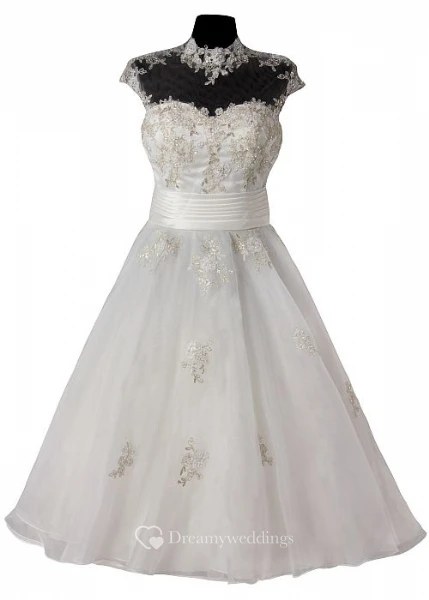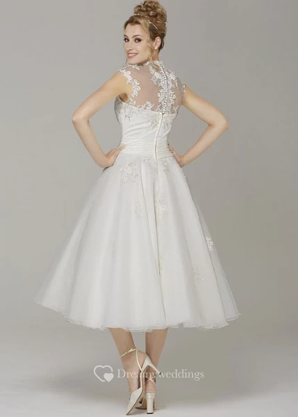 A-Line High Neck Cap-Sleeve Tea-Length Tulle Wedding Dress With Appliques And Illusion
