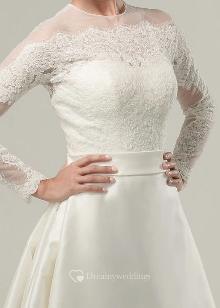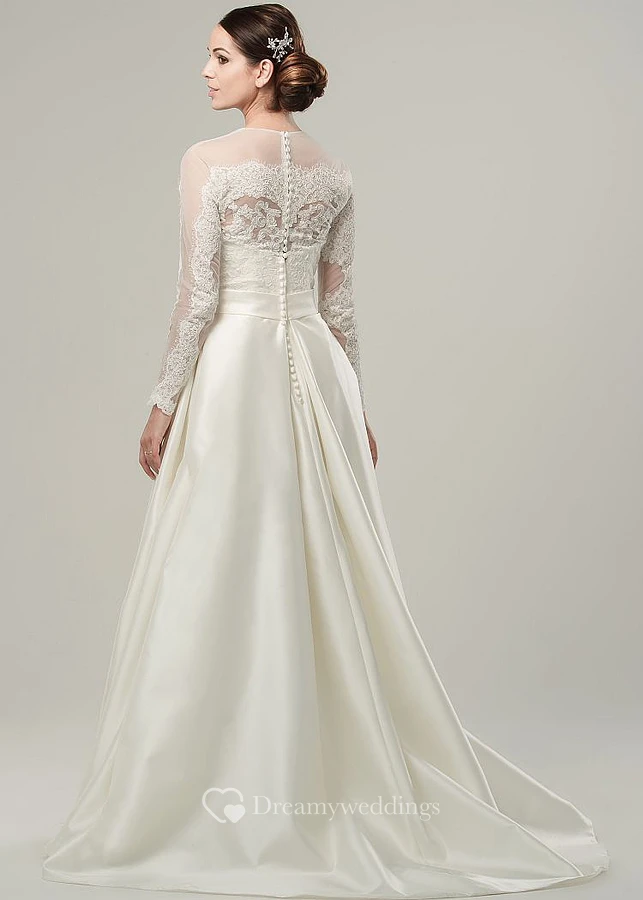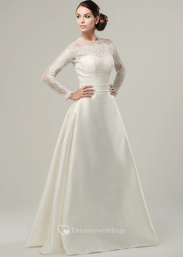 A-Line High Neck Long-Sleeve Satin Wedding Dress With Illusion