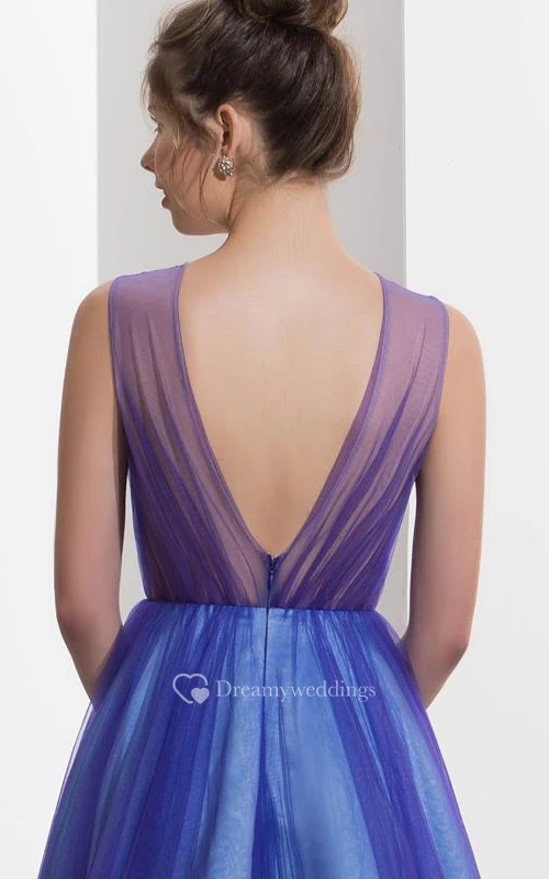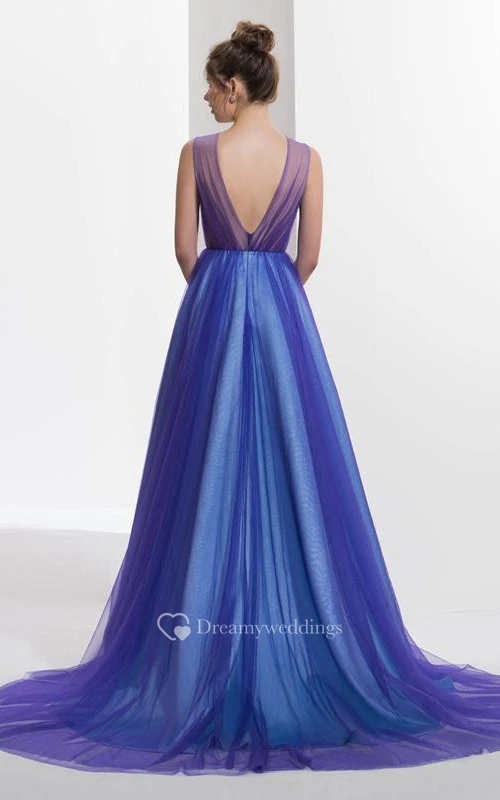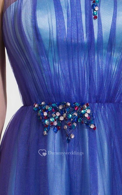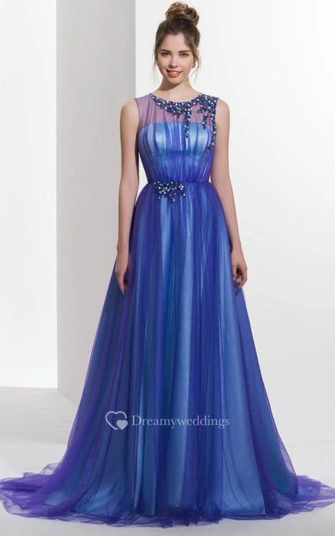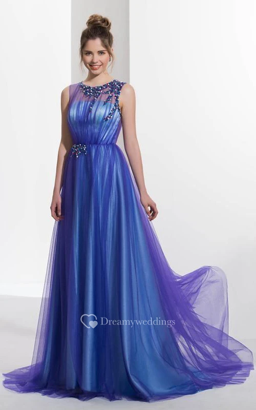 A-Line Jewel Neck Beading Pleats Court Train Prom Dress