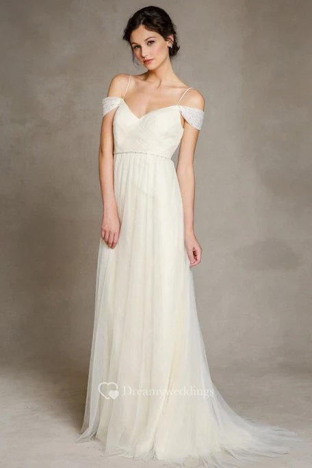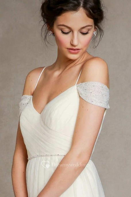 A-Line Jeweled Floor-Length Spaghetti Tulle Wedding Dress With Pleats