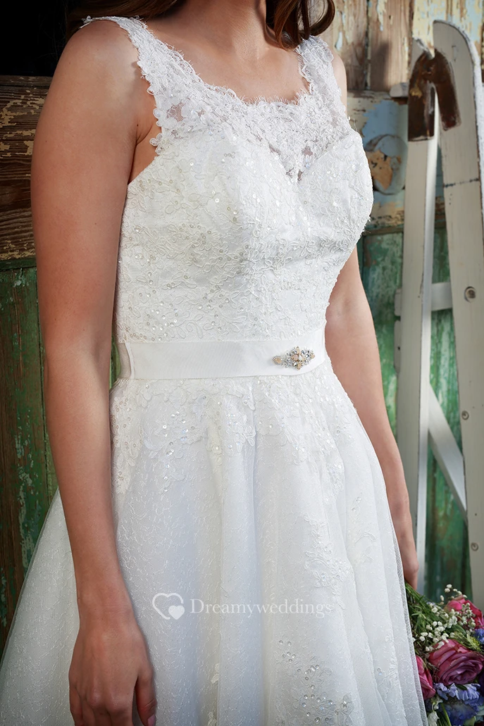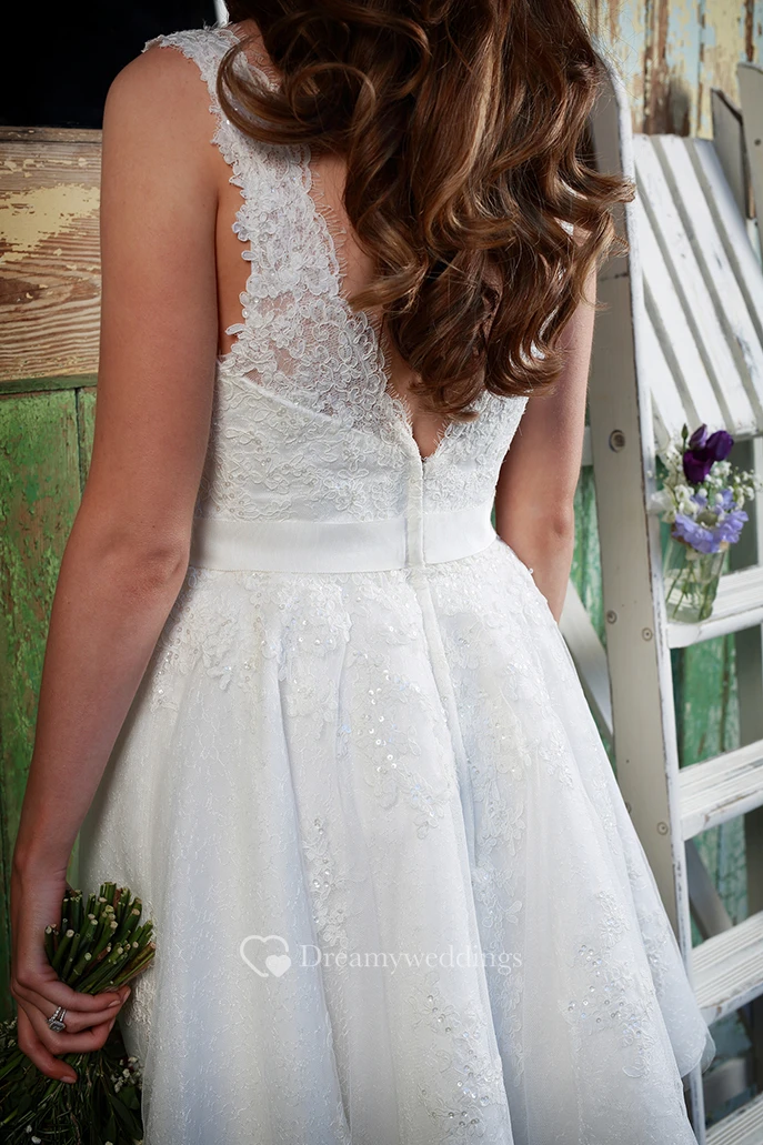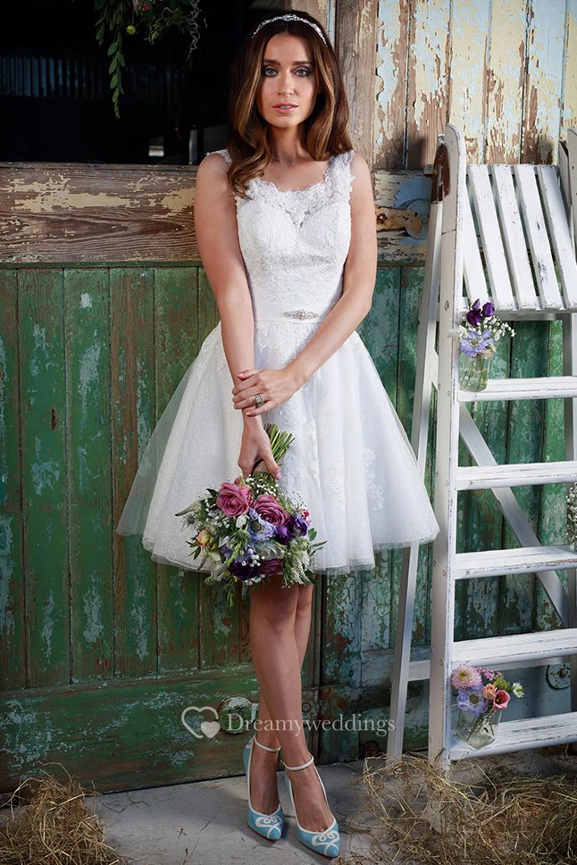 A-Line Jeweled Short Sleeveless Square-Neck Lace Wedding Dress With Appliques And V Back