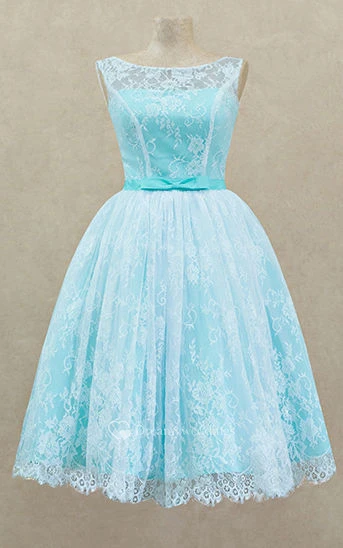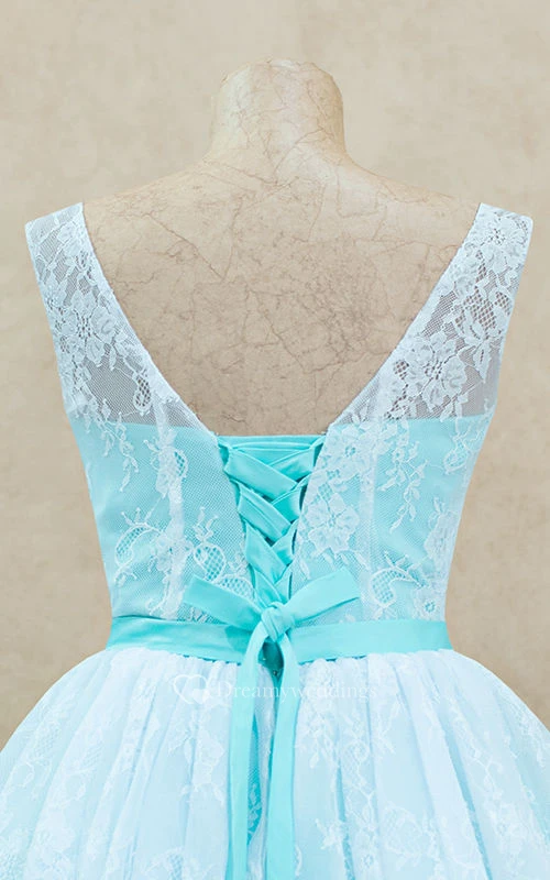 A-Line Knee-Length Bateau Short Sleeve Lace Sash Pleats Lace-Up Dress