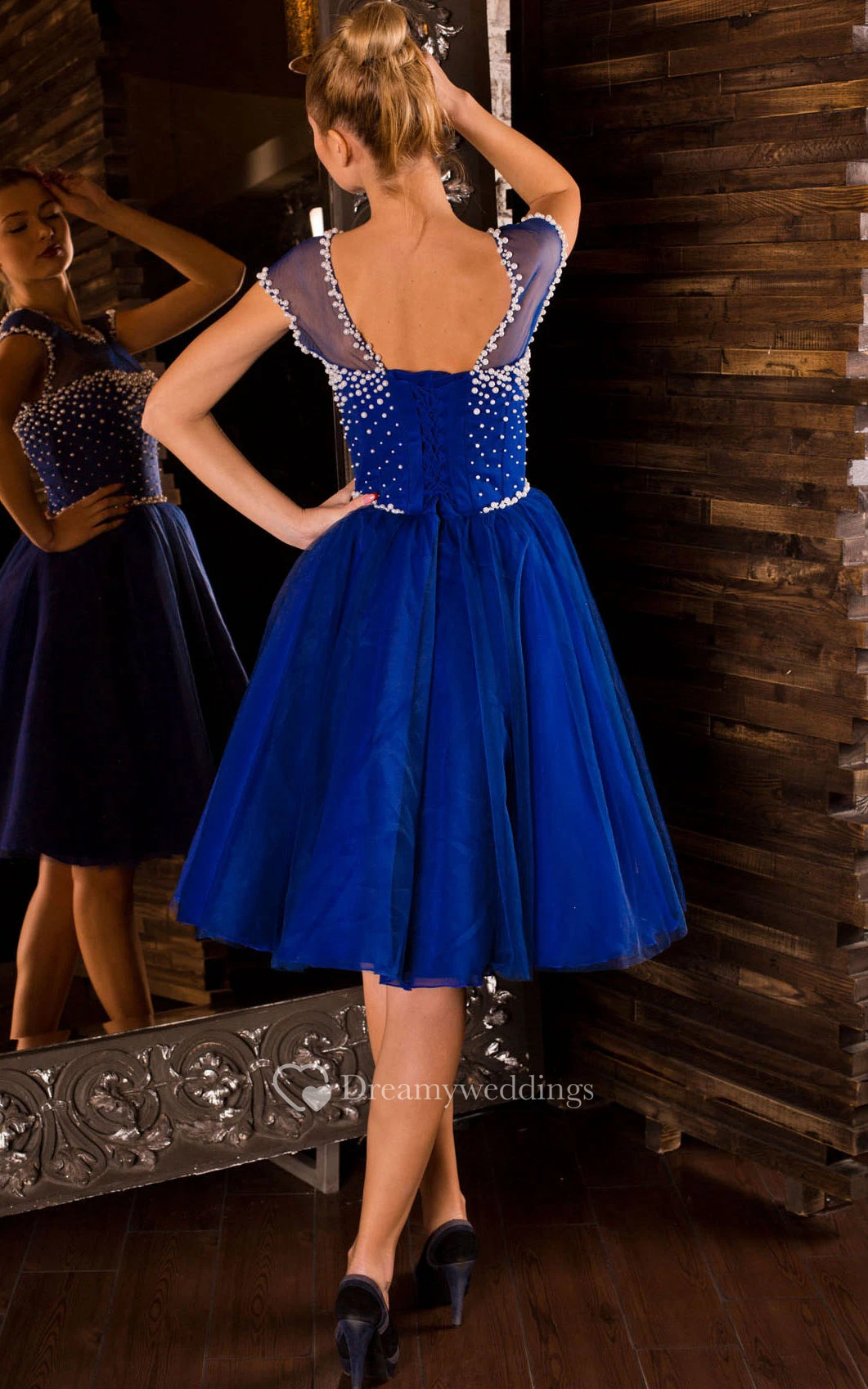 A-Line Knee-Length Jewel Short Sleeve Tulle Beading Pleats Lace-Up Dress