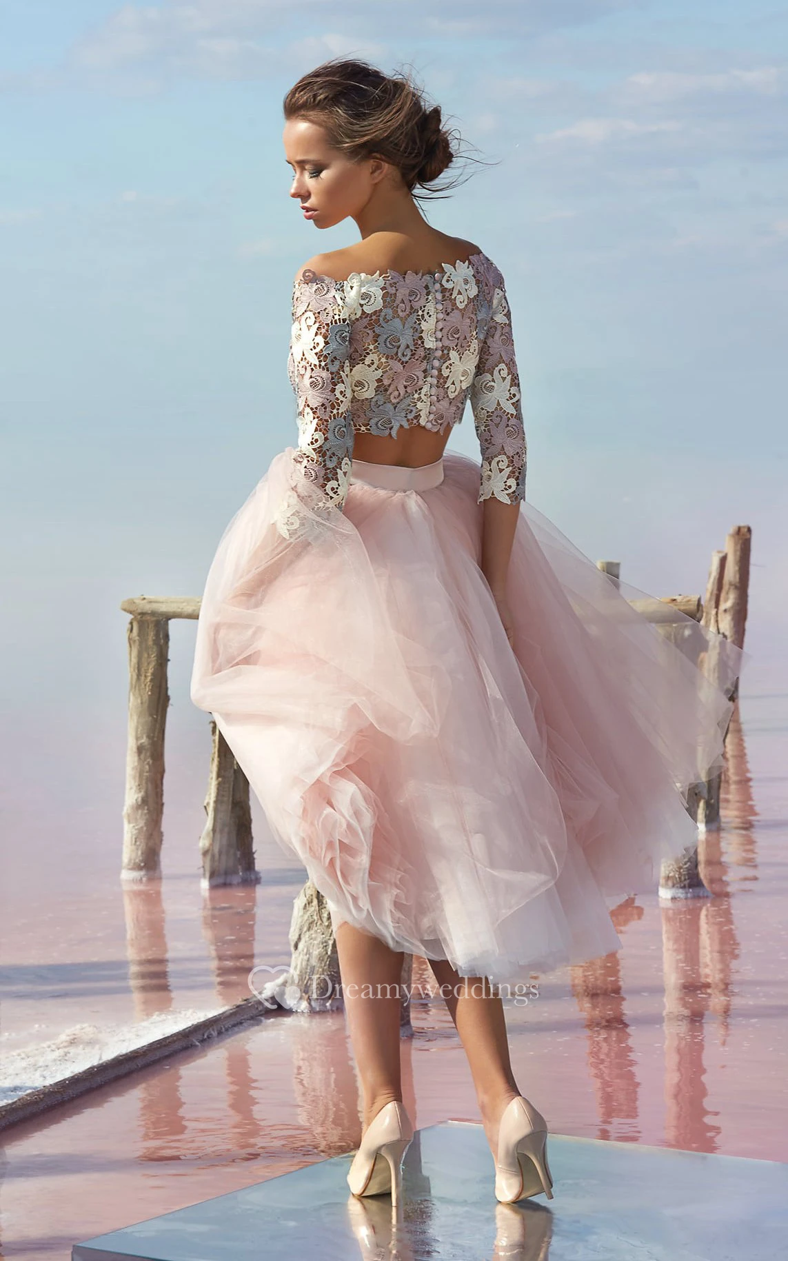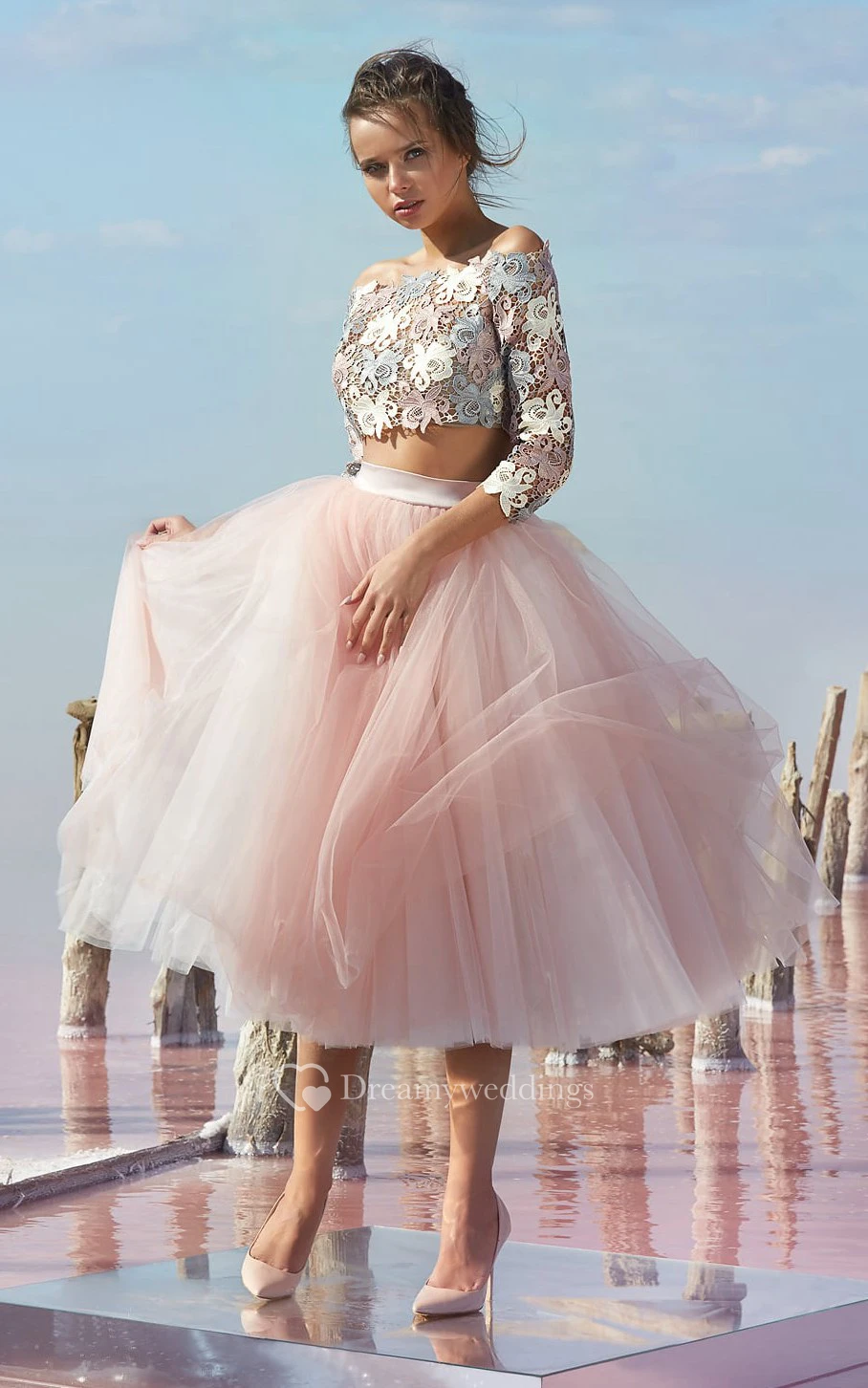 A Line Knee Length Off The Shoulder 3 4 Length Sleeve Tulle Button Dress