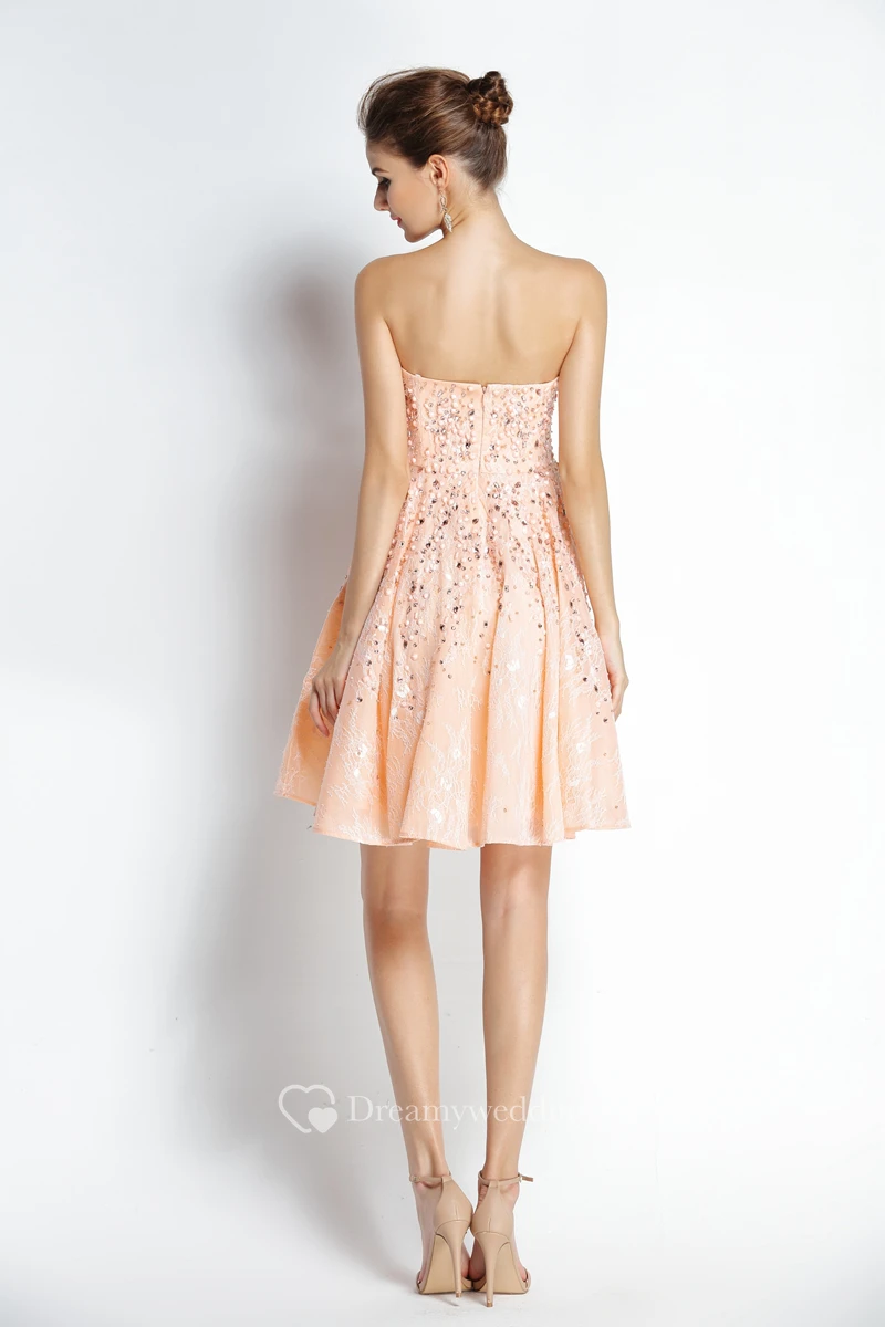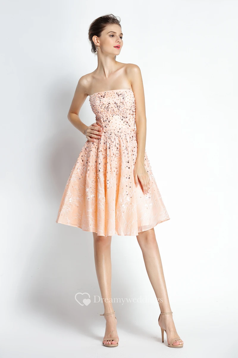 A-Line Knee-length Strapless Lace Sleeveless Prom Dress with Beading