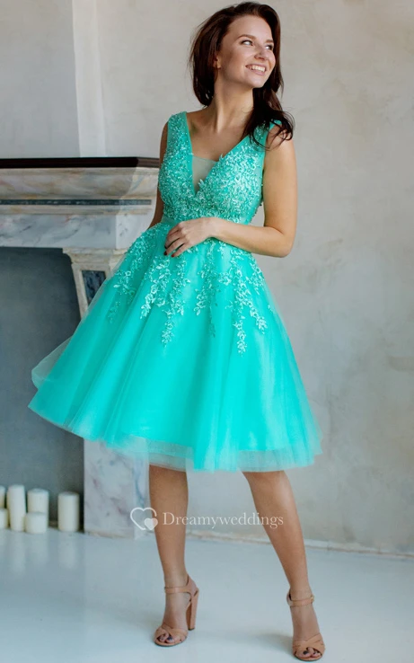 A-Line Knee-Length V-Neck Short Sleeve Tulle Lace Appliques Low-V Back Dress
