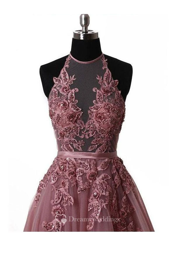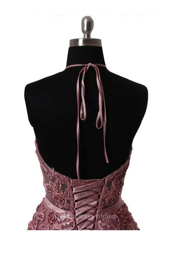 A-Line Lace Tulle High Neck Sleeveless Lace-up Corset Back Dress