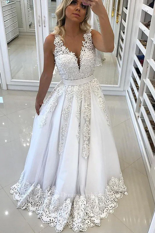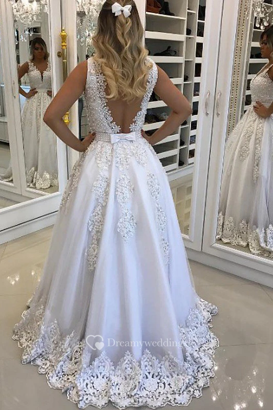 A-Line Lace Tulle V-neck Sleeveless Open Back Deep-V Back Dress
